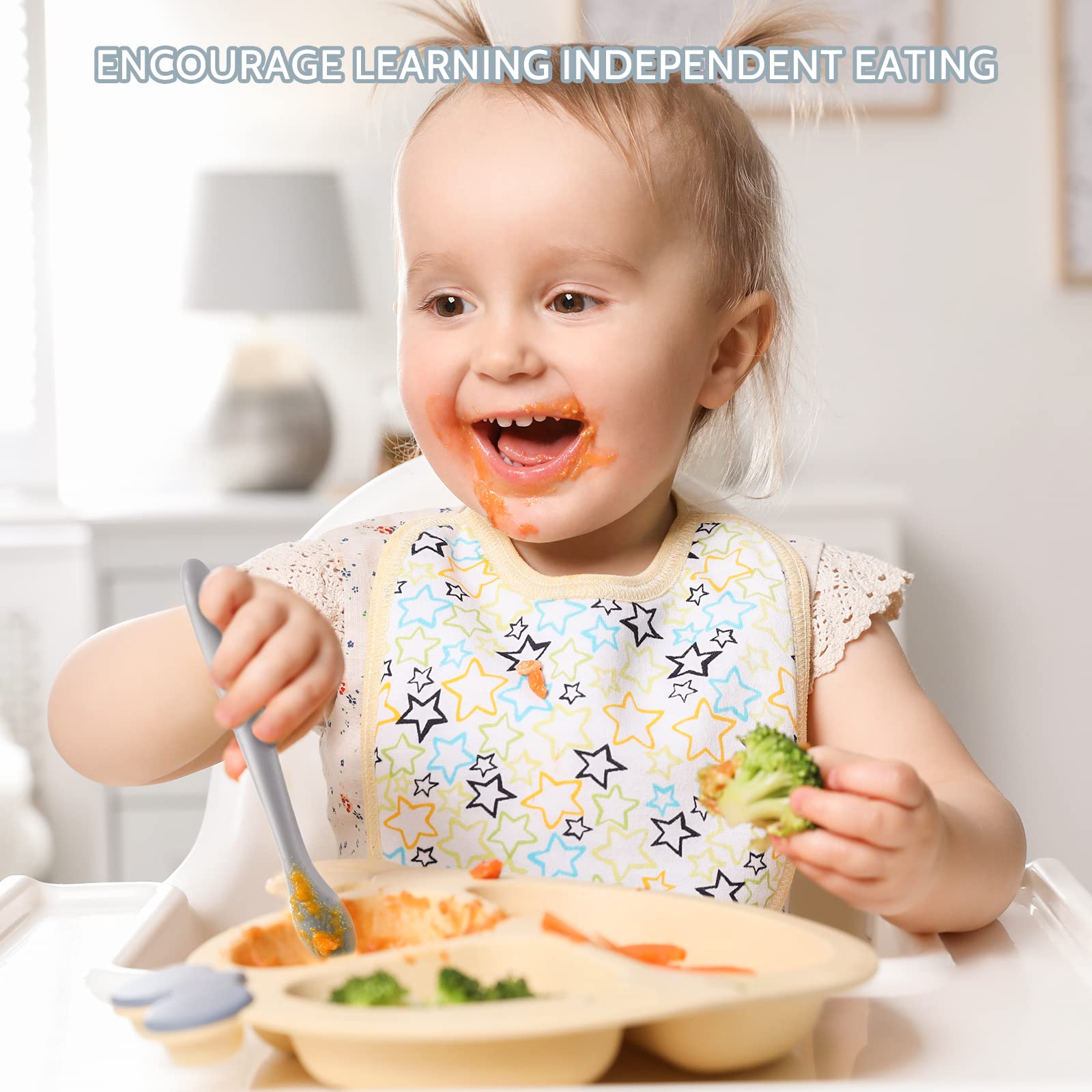 Soft, Pliable Spoon & Tip: Spoons are smooth and comfortable for baby's soft and fragile hands without the cumbersome carvings and patterns that rub hands. The flexible and soft spoon tips have no support inside and are not hard like plastic or metal spoons, which are good protection for babies' delicate and sensitive mouths and developing teeth. Smooth design prevents water and food from getting trapped, starting solids is a breeze with our silicone spoons!