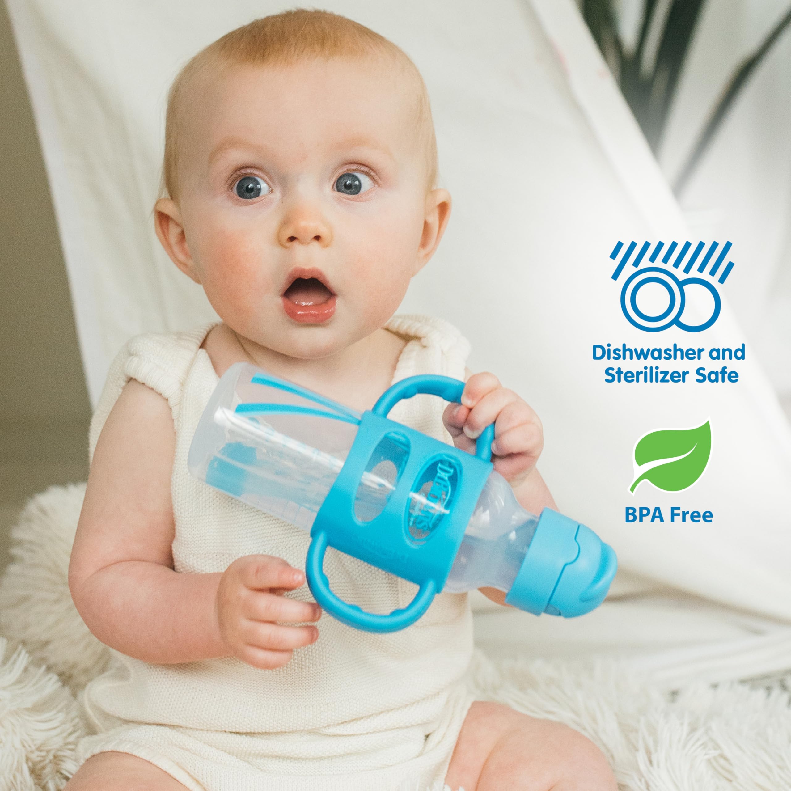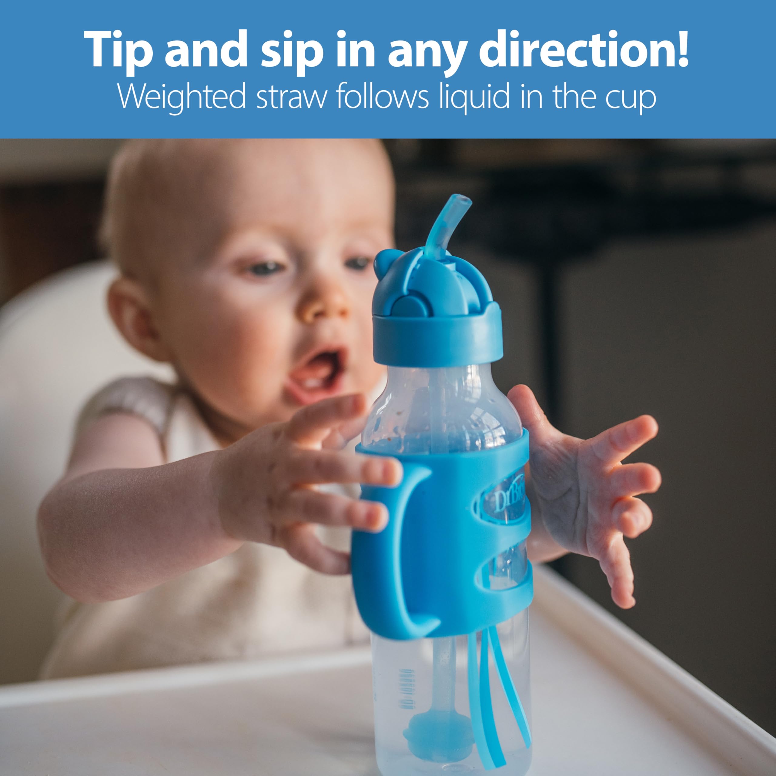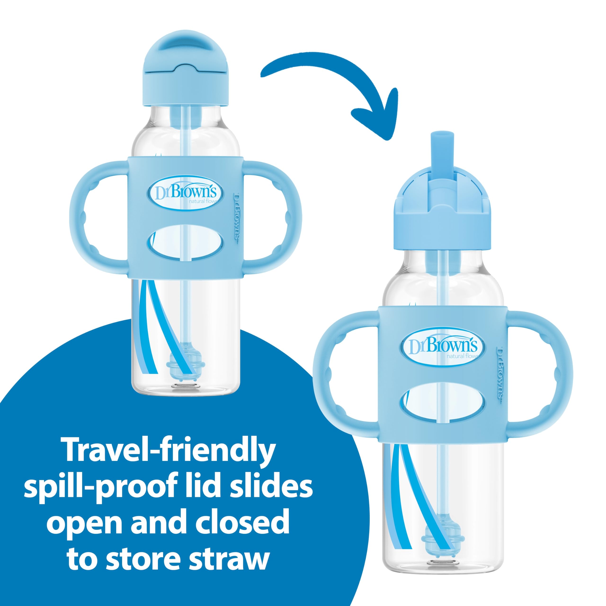 Dr. Brown's Milestones Sippy Straw Bottle is the easy way to help baby develop new drinking skills! Baby can continue to use the bottle they love while transitioning from bottle to big kid drinking. The soft silicone weighted straw moves to follow liquid inside the bottle, so baby can tilt and sip while transitioning from tipping the bottle upside-down to sipping upright. Soft yet sturdy silicone handles make gripping easy and help teach baby new motor skills. The spill-proof lid is travel-friendly and slides closed to keep the straw clean when not in use. Both the sippy straw lid and silicone handles fit all Dr. Brown’s Options+ 8 oz/250 mL baby bottles and sippy spout bottles. Straw cleaning brush included. Dishwasher (top rack) and sterilizer safe. BPA-free. 6m+.