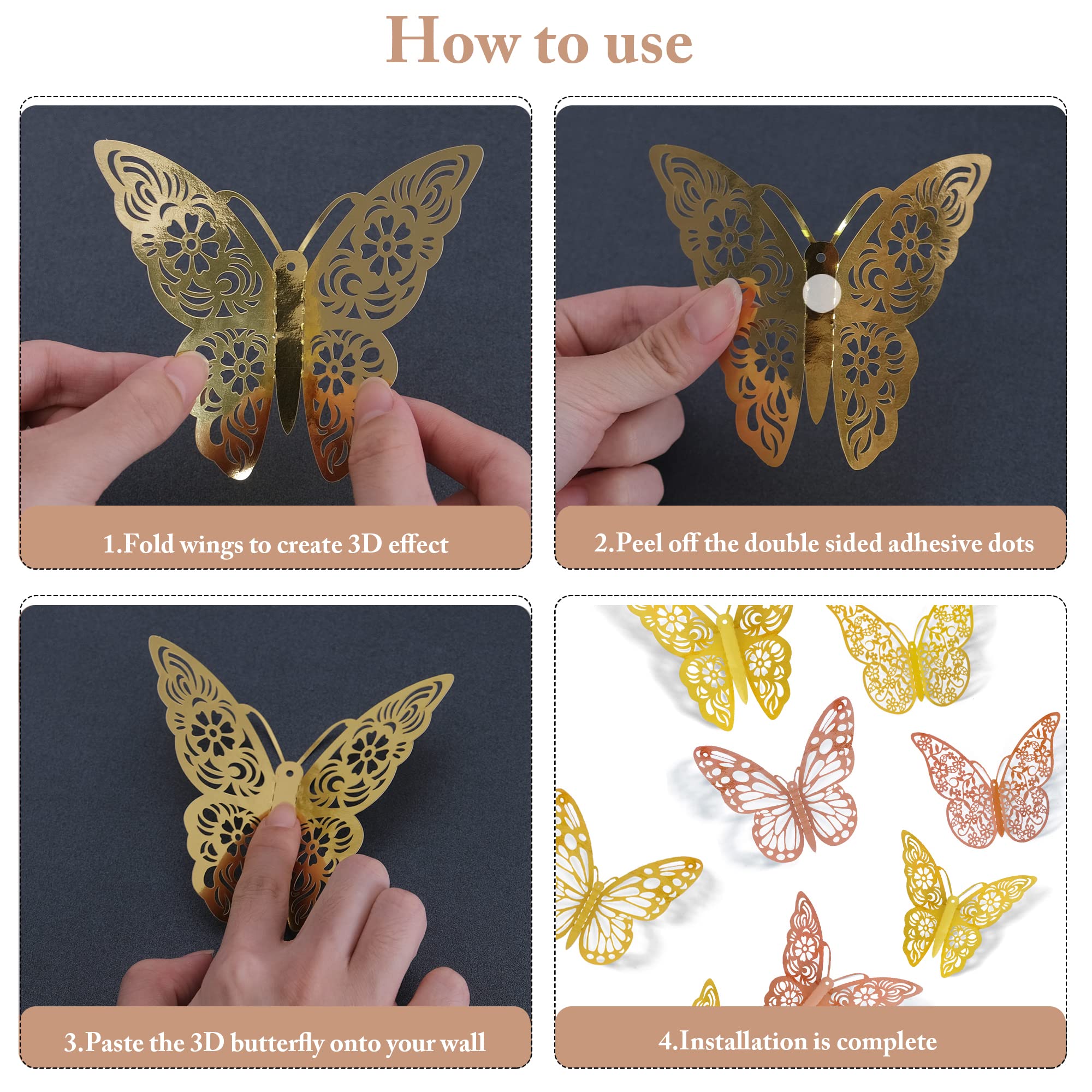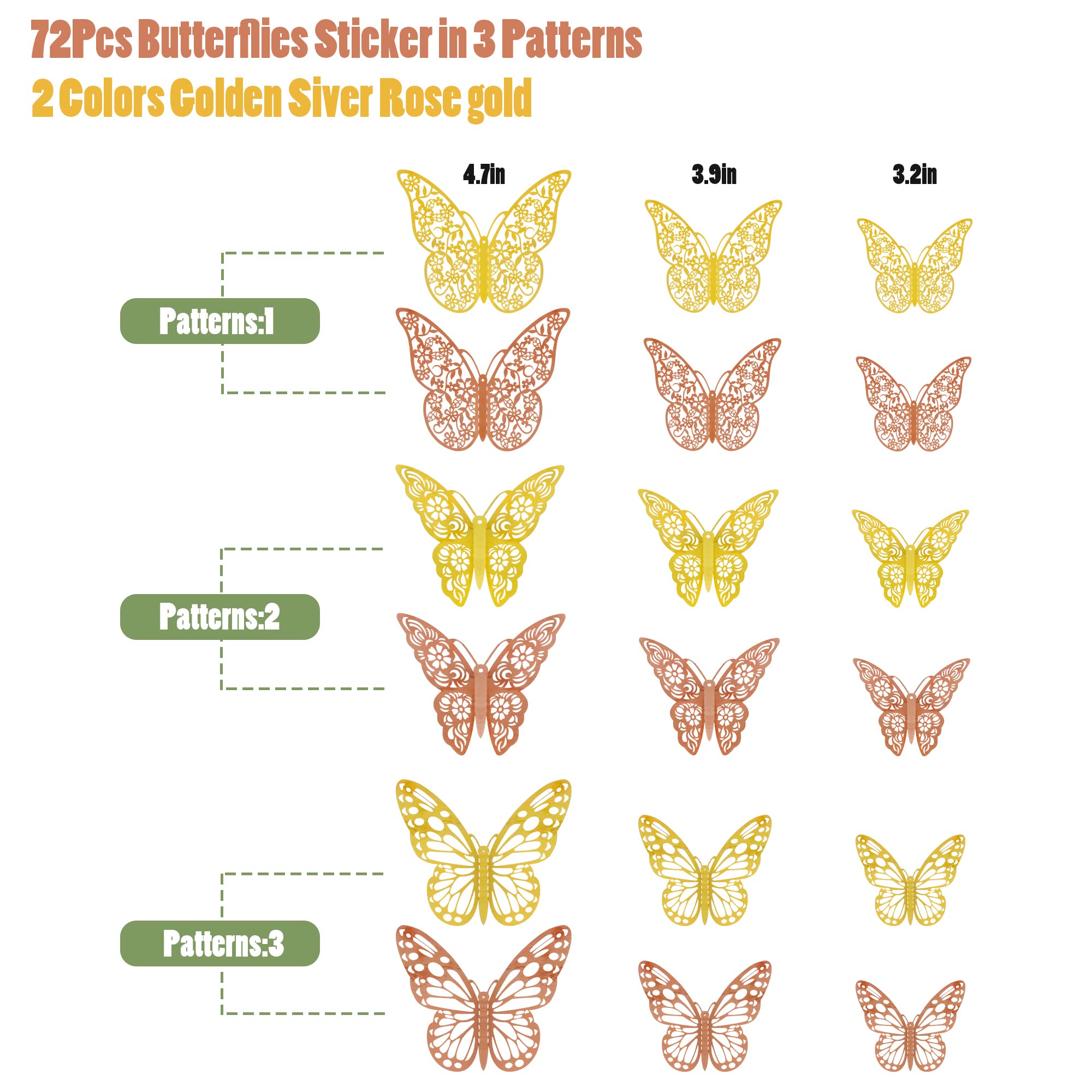 【Package Included】72pcs butterfly wall stickers: 24 pcs Style 1, 24 pcs Style 2, 24 pcs Style 3, each style has 3 sizes(3", 4", 5") and each size has 4pcs. Coming with 72pcs double sided adhesive dots.