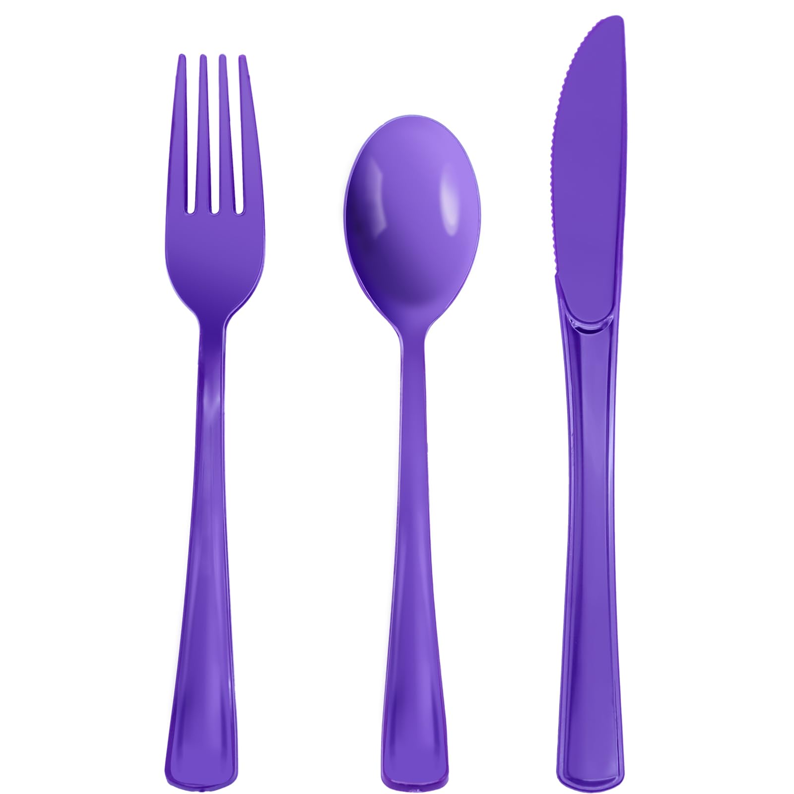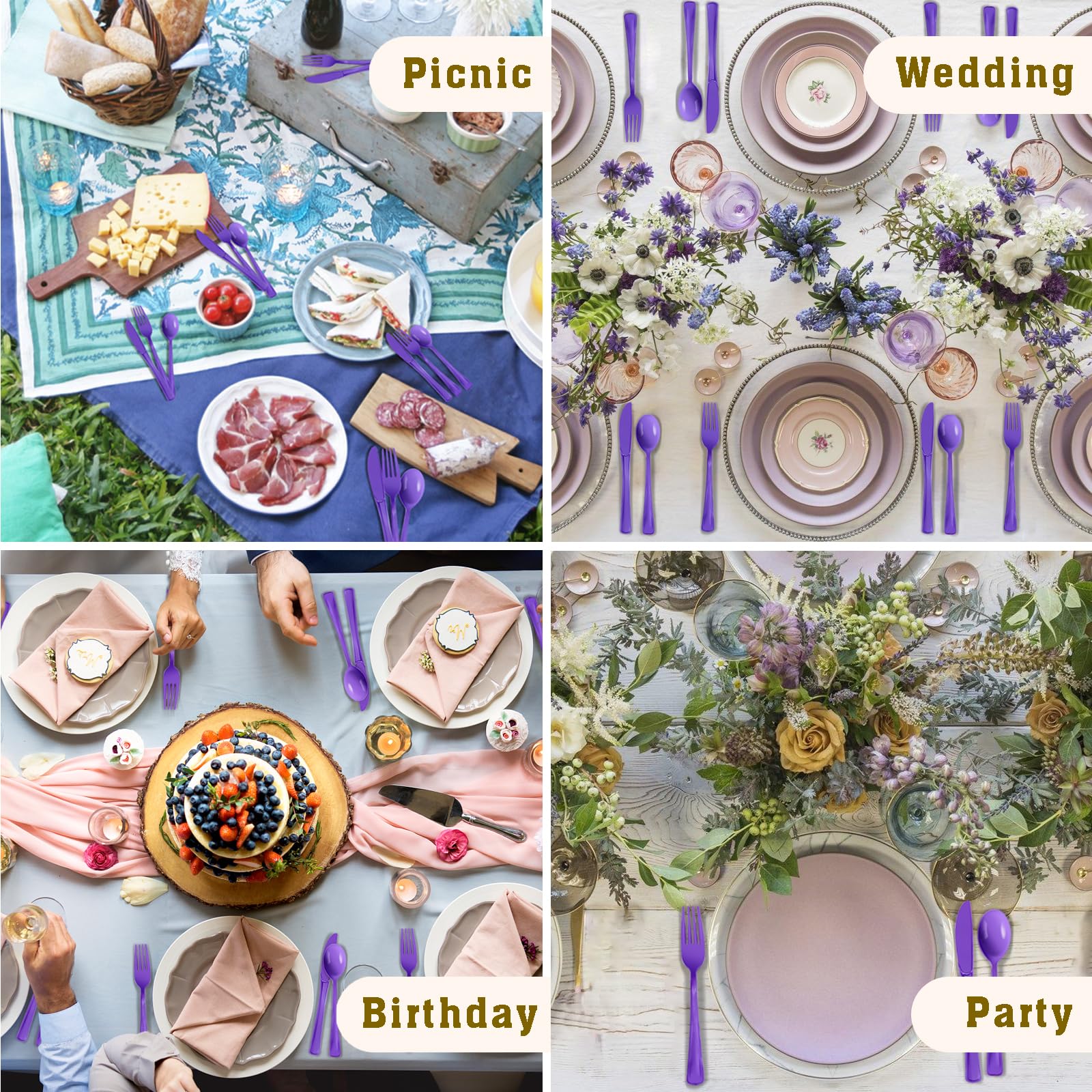 【High Quality Materials】: The purple plastic silverware is made of food-grade plastic material, which is non-toxic and harmless and can be in direct contact with food. High-temperature resistant and suitable for all types of food, whether cutting meat or scooping soup, the purple plastic silverware meets customers' needs.Offering multiple different color options, they are sure to match your decor.