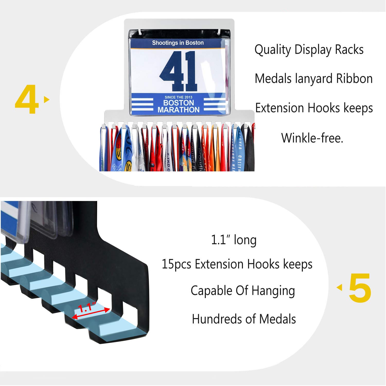 ✨【TAKE CARE OF YOUR AWARDS】To protect your awards and valuable honors, we’ve smoothed and beveled the edges. There are no burrs or sharp edges, so don't worry about damaging, or creasing your awards. Compare our race medal holder wall hanger to other marathon medal display, they’re made to last with resistance to durable and sturdy