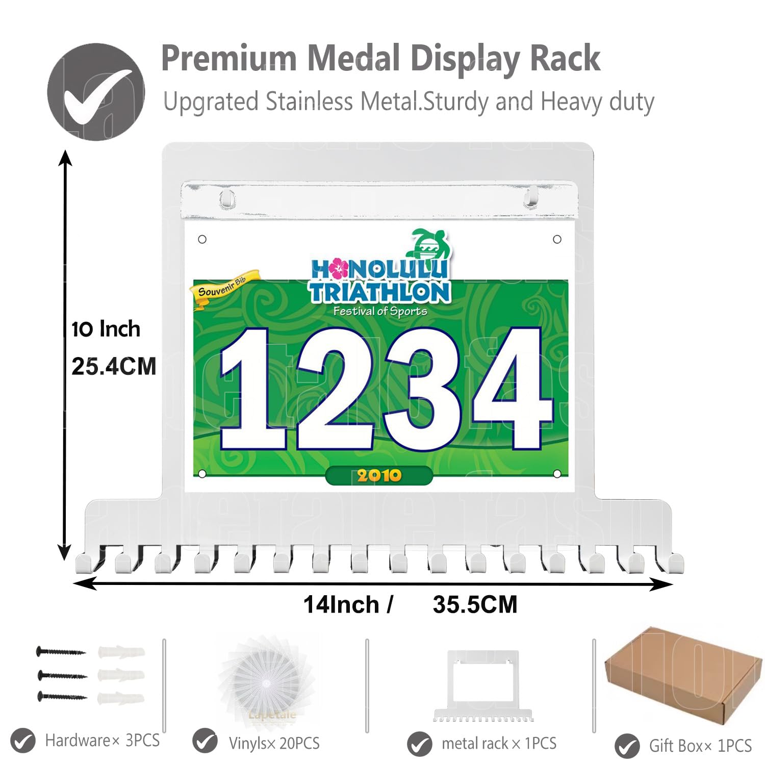 ✨【PACKAGE】①race medal holder wall hanger design is not only a esthetic home decoration but also a great gift for your family or friends. ②1 piece of race bib and medal display with 20 pieces race bib holder pouches, the size 14" x 10", at least 40+ number plates and 60+ medals can be stored, big space designs to meet your various needs for medals storage,1 piece of medal hanger display for runner instructions,③3 piece of race medal display hardware accessories,1 piece of Box