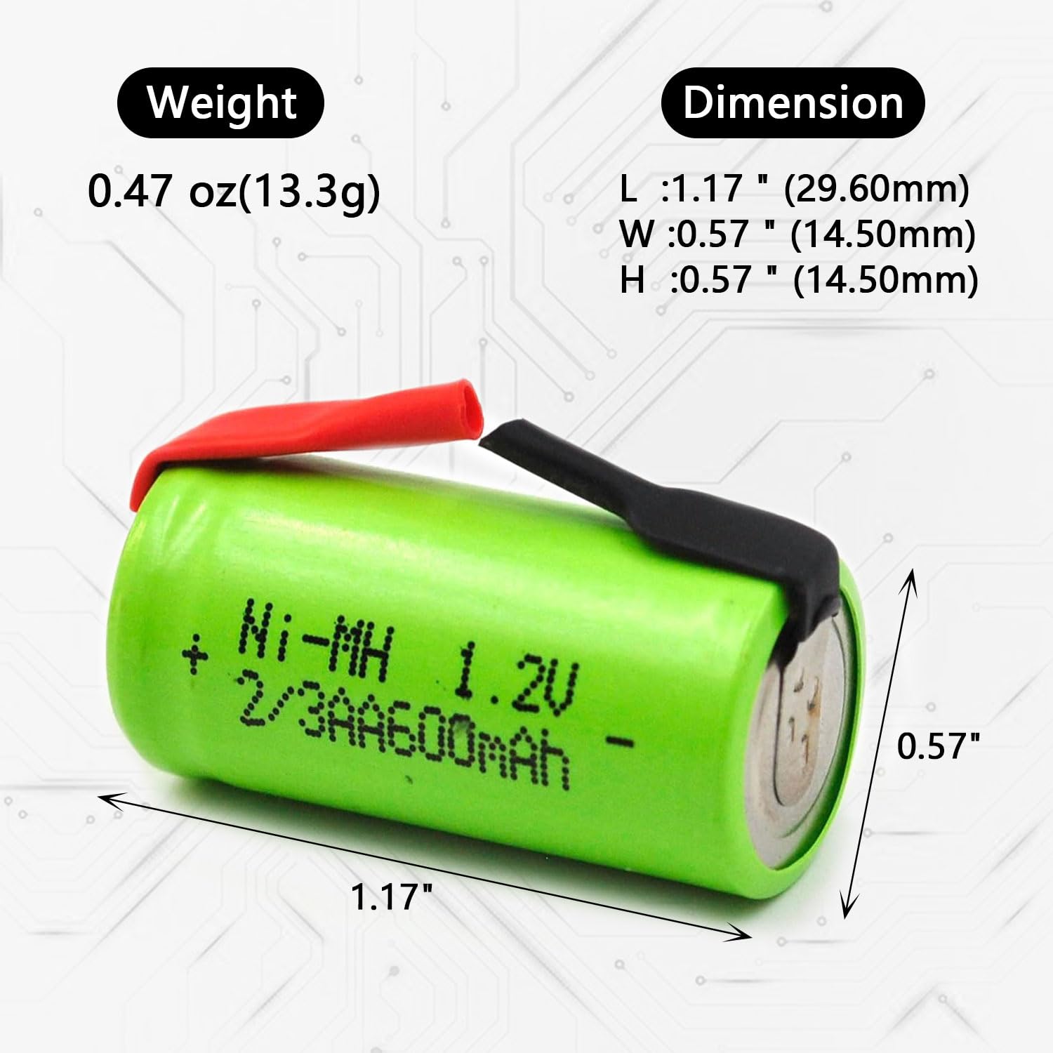 BATTERY SPECIFICATIONS: 2/3AA cell size, 1.2V output, 600mAh capacity, Ni-MH chemistry, built for high-drain devices.
