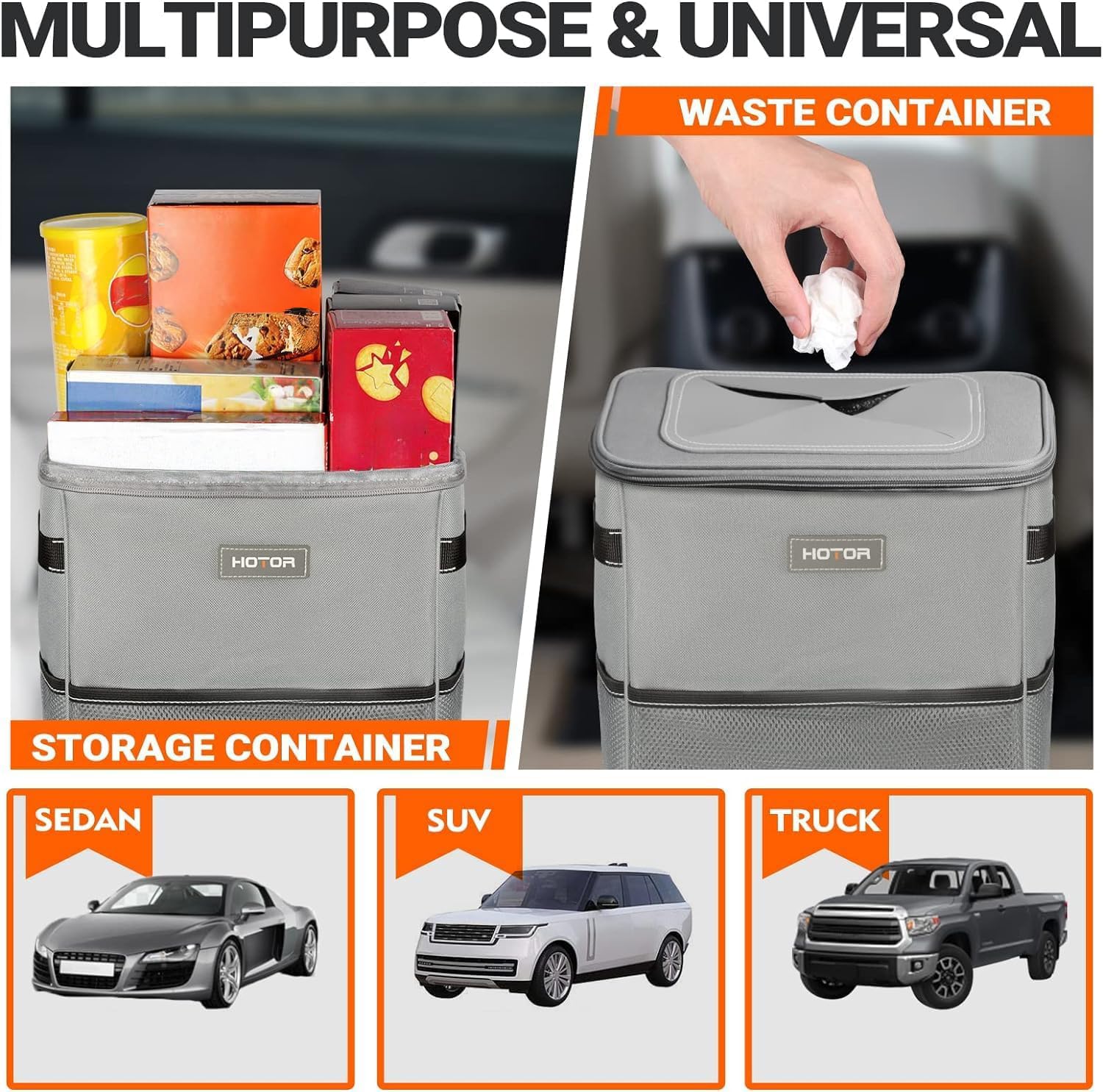 WIDE APPLICATIONS: HOTOR car trash can provides people troubled by annoying messes with a practical solution for the whole-car trash storage. No matter where you go, HOTOR car trash can always keeps your cars, SUVs, pickups, or trucks pleasantly clean and organized throughout the drive! With a HOTOR car garbage can in the reach, you can rest assured that your drive is neatly hassle-free!