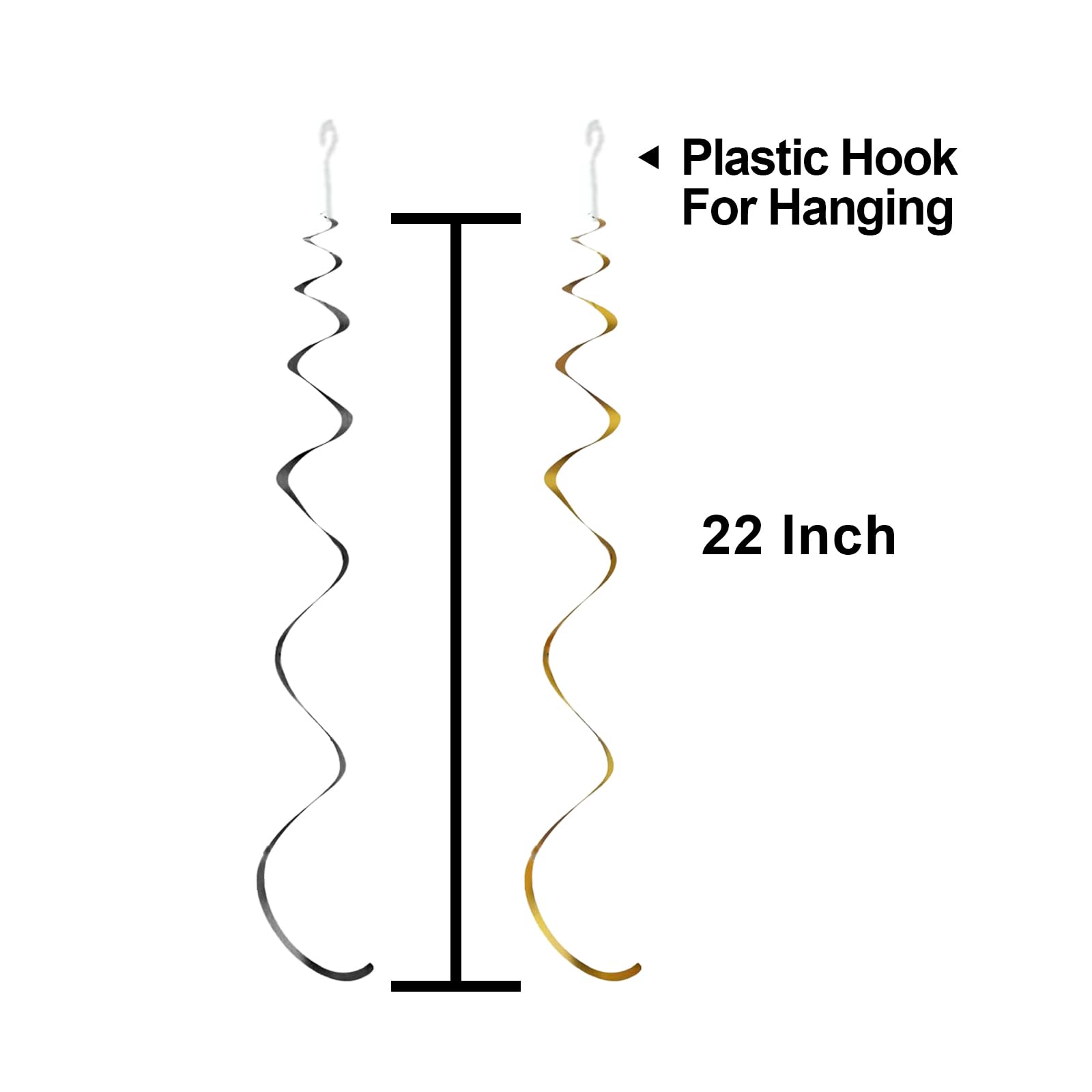 birthday party hanging swirl decorations: premium quality: sturdy cardstock color: black and gold design: double-printed. Traditional black and gold color. package includes: 10 hanging swirls with cutouts Easy to use: pre-assembled, just open the package and ready for decoration. perfect for: birthday party decorations. Can be used indoor and outdoors. how to use: Pull from the middle to get a rotating shape and can be hung with plastic hooks.