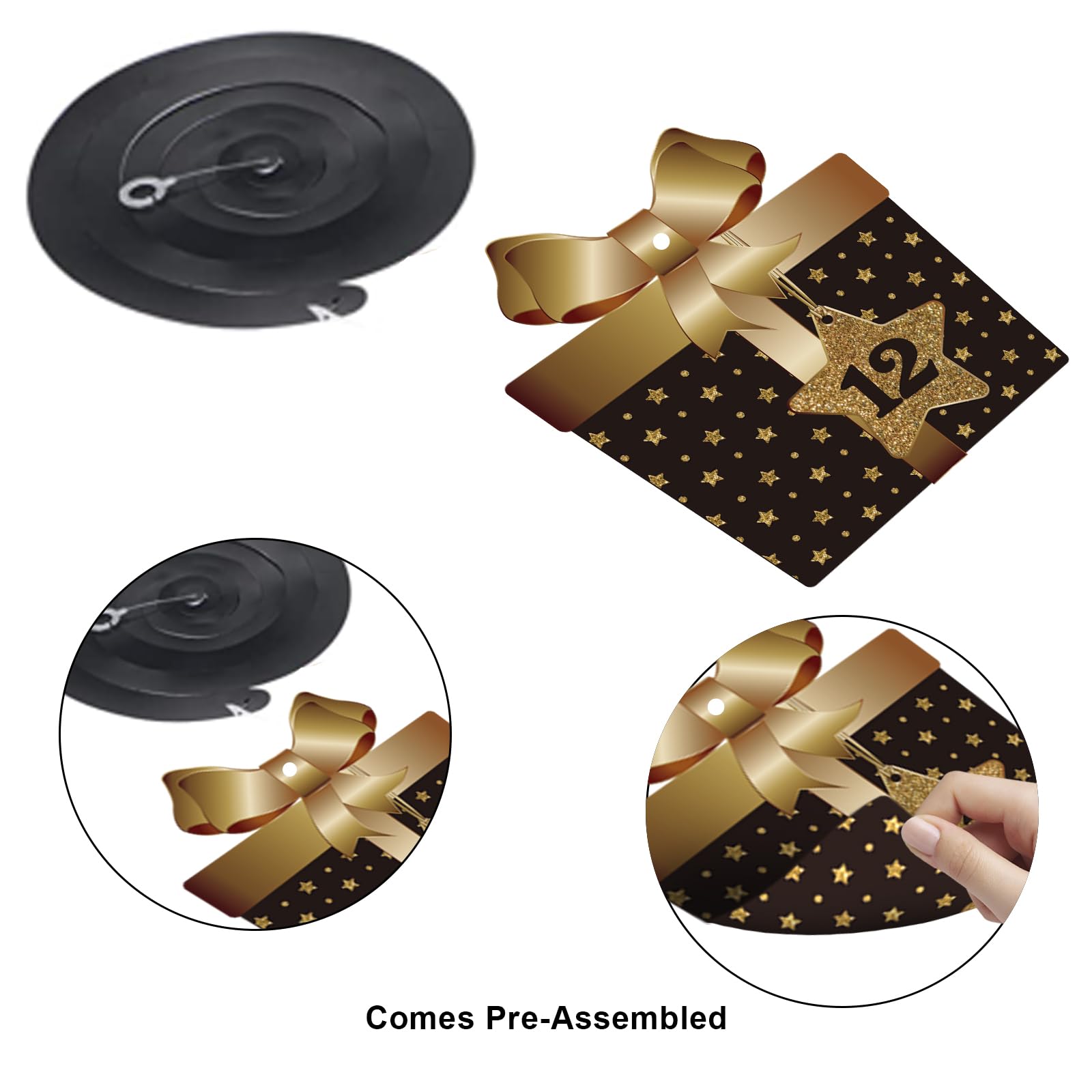 12th Birthday Decoration Kit: Comes with total 10 different hanging swirls in the kit. The cutouts are double-sided design in black glitter color. The swirls are shiny metallic foil swirls. There are a variety of birthday element patterns including gift box, hat, cake and other popular patterns…