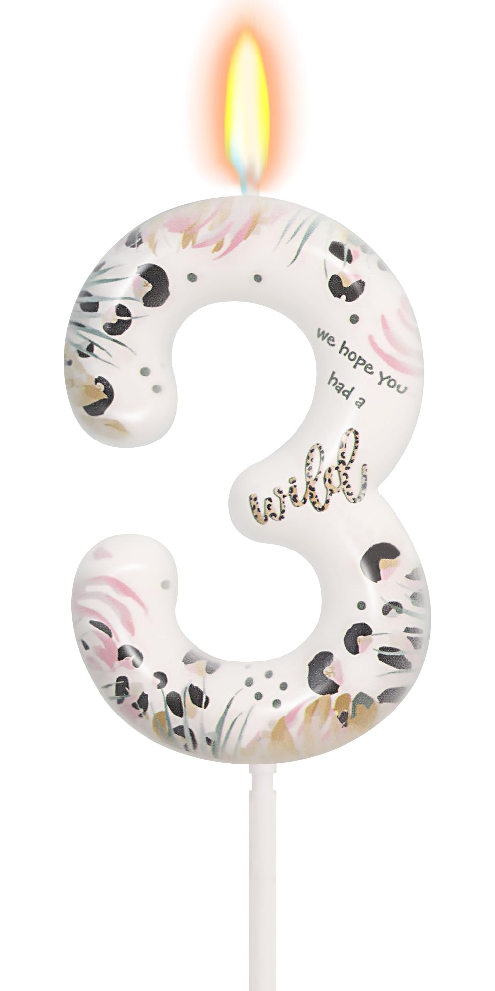 Unique Wild-Themed Design: Adorned with floral accents and leopard print details, this number “3” birthday candle embraces a playful “wild” theme. The phrase “we hope you had a wild” adds whimsical charm, making it a standout centerpiece for jungle/animal-themed 3rd birthday parties