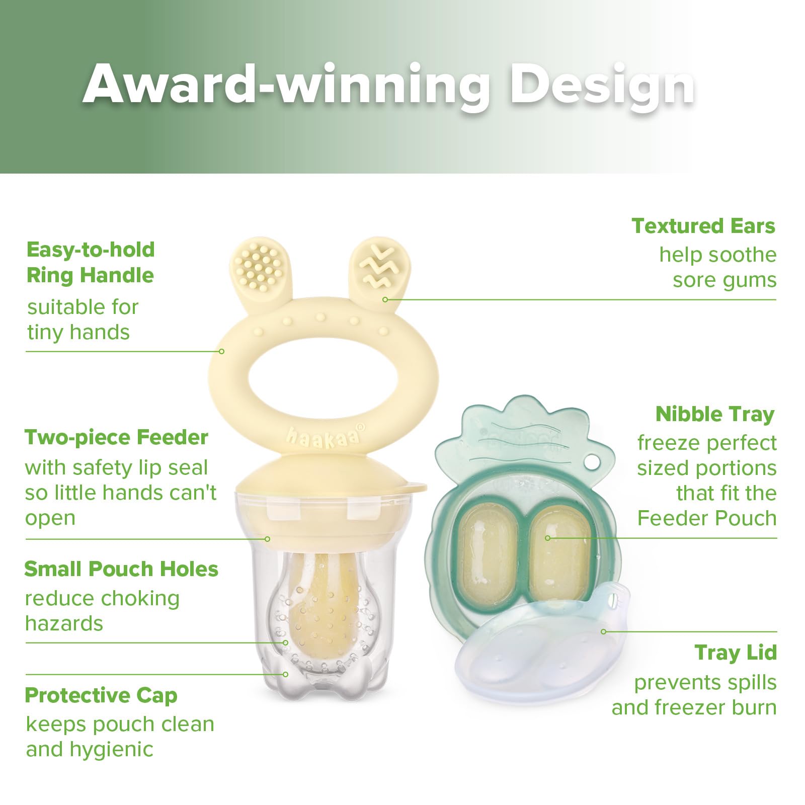 INTRODUCE SOLIDS SAFELY: Haakaa's award-winning Silicone Feeder features a pouch with fine holes that allow only tiny food pieces to pass through, reducing choking risks.