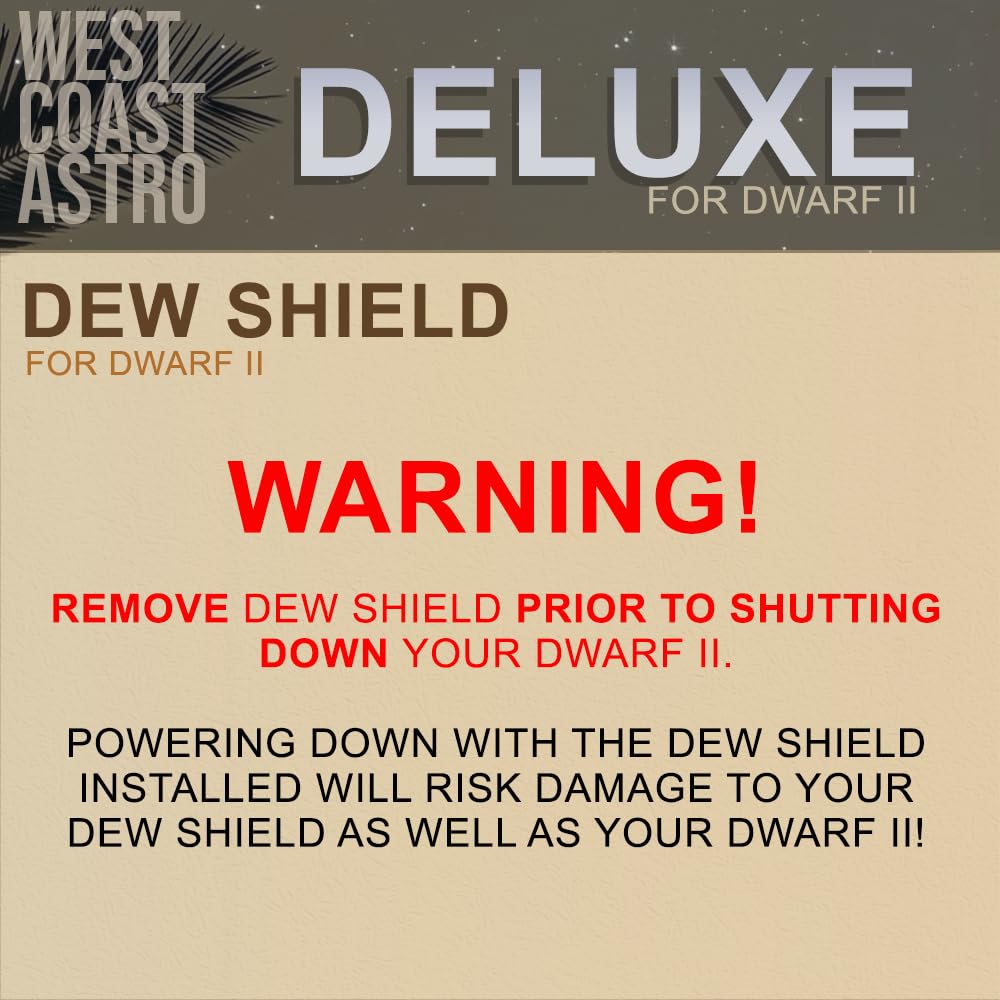 This is custom designed to fit the DWARFLAB DWARF II Smart Telescope. (the BEIGE DWARF). What is a Dew Shield? A Dew Shield is used to reduce moisture build-up on your optics while using the telescope. A Dew Shield is also a useful device that can effectively block unwanted light from angles away from the direction of the target you are viewing - To use, simply screw the Dew Shield onto your DWARF II Filter Adapter and your set. If you decide to attach additional accessories, simply screw them onto the end of the Dew Shield and use as expected. - Our Dew Shield measures 1.25 inches in length (31.75mm) - Our Dew Shield is Custom 3D designed and printed using ABS. ABS is known to be very strong and resilient to temperature changes. ABS is also used in other applications including Toy Building Bricks, Sports Equipment and Automotive components When you are finished with your viewing session, remember to always remove the Dew Shield and Filter Adapter prior to powering down your telescope. Never power down with it attached! *This only includes (1) West Coast Astro Deluxe Dew Shield for DWARF II Smart Telescope, it does not include any shown Filters or Telescope. *This is a telescope accessory.