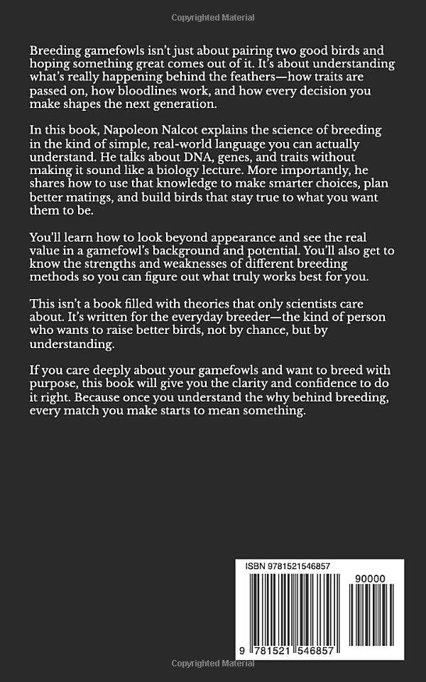 Breeding gamefowls isnโt just about matching a strong cock with a proven hen and hoping for the bestโitโs about understanding the science that makes great bloodlines possible. In this straightforward and easy-to-grasp guide, Napoleon Nalcot breaks down the complex world of gamefowl genetics into simple, practical lessons that any breeder can follow. Youโll learn how DNA and genes shape every trait your birds possessโfrom strength, cutting ability, and endurance to attitude and intelligence. More importantly, youโll discover how to use that knowledge to make smarter breeding choices, predict outcomes, and improve your line with purpose instead of guesswork. Written in clear, everyday language and grounded in real experience, Gamefowl Genetics helps both beginners and enthusiasts understand what truly makes a superior breeding program. Nalcot shares not just theories, but tested insights and methods drawn from years of hands-on breedingโso you can select, plan, and breed with confidence. Whether youโre new to the keep or refining your existing line, this book will help you see breeding not as luck, but as a skillโone that blends knowledge, patience, and careful observation to build birds that carry both power and purpose. A must-read for anyone serious about breeding gamefowls the right way.
