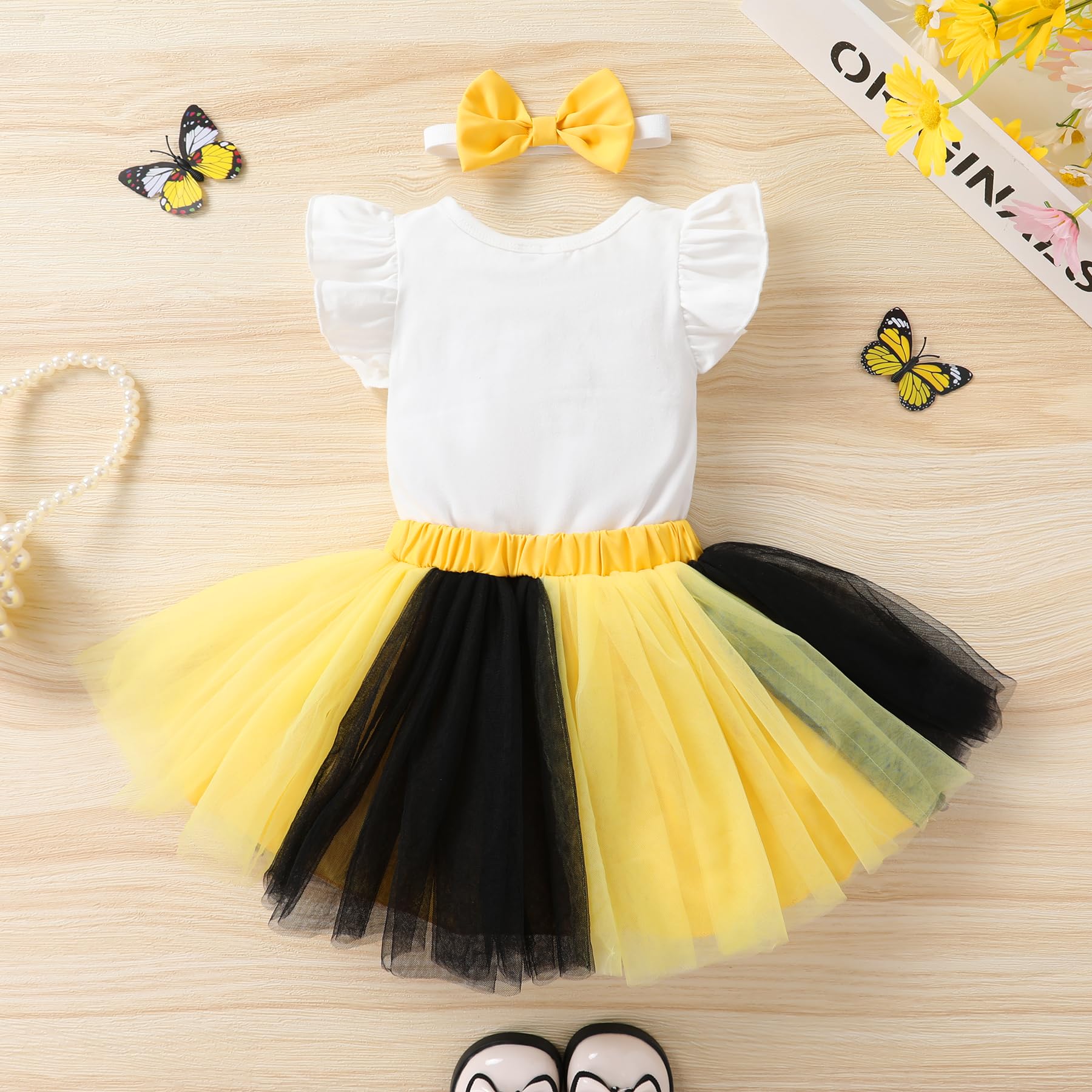 🐝Adorable Design: "ONE"bee/sunflower/cow letters printed in organic cotton romper with yellow tutu skirt, so adorable for your little one.