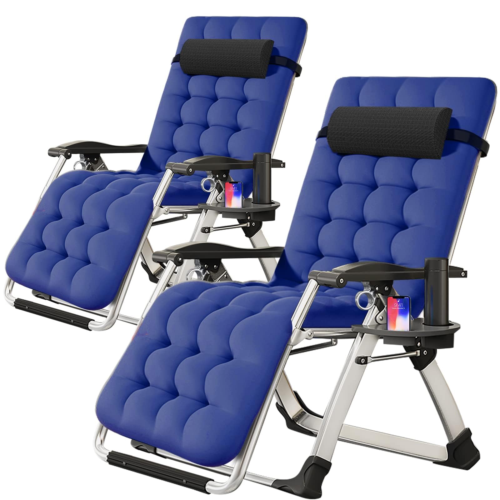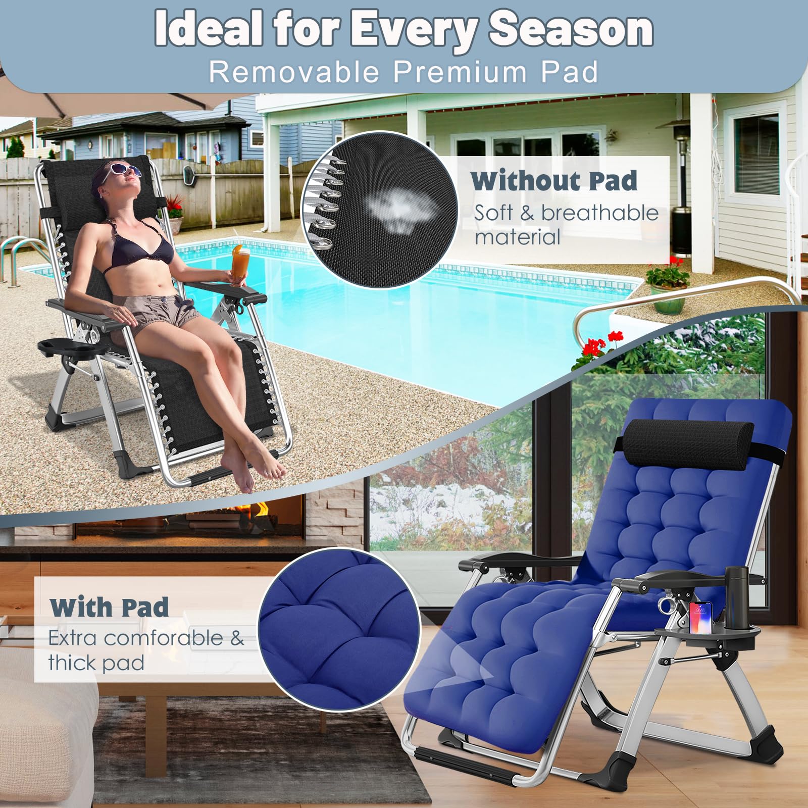 Adjustable and Zero-gravity: Our zero-gravity lounge chair has an adjustable design that can be adjusted from 90 to 170-degree angle. This amazing feature helps you select the optimal angle that brings you to a comfortable, relaxing position. Simply push the clip to unlock the position, and pull the clip back to secure it at your desired position. Note: Full-flat chaise lounge chair has no function of zero gravity