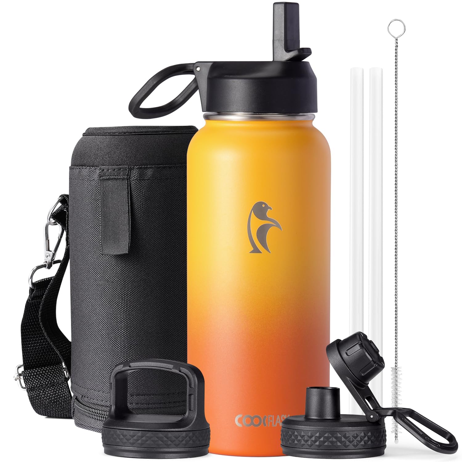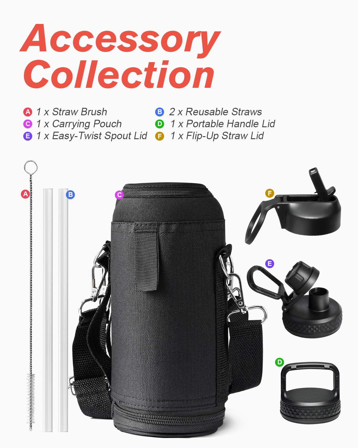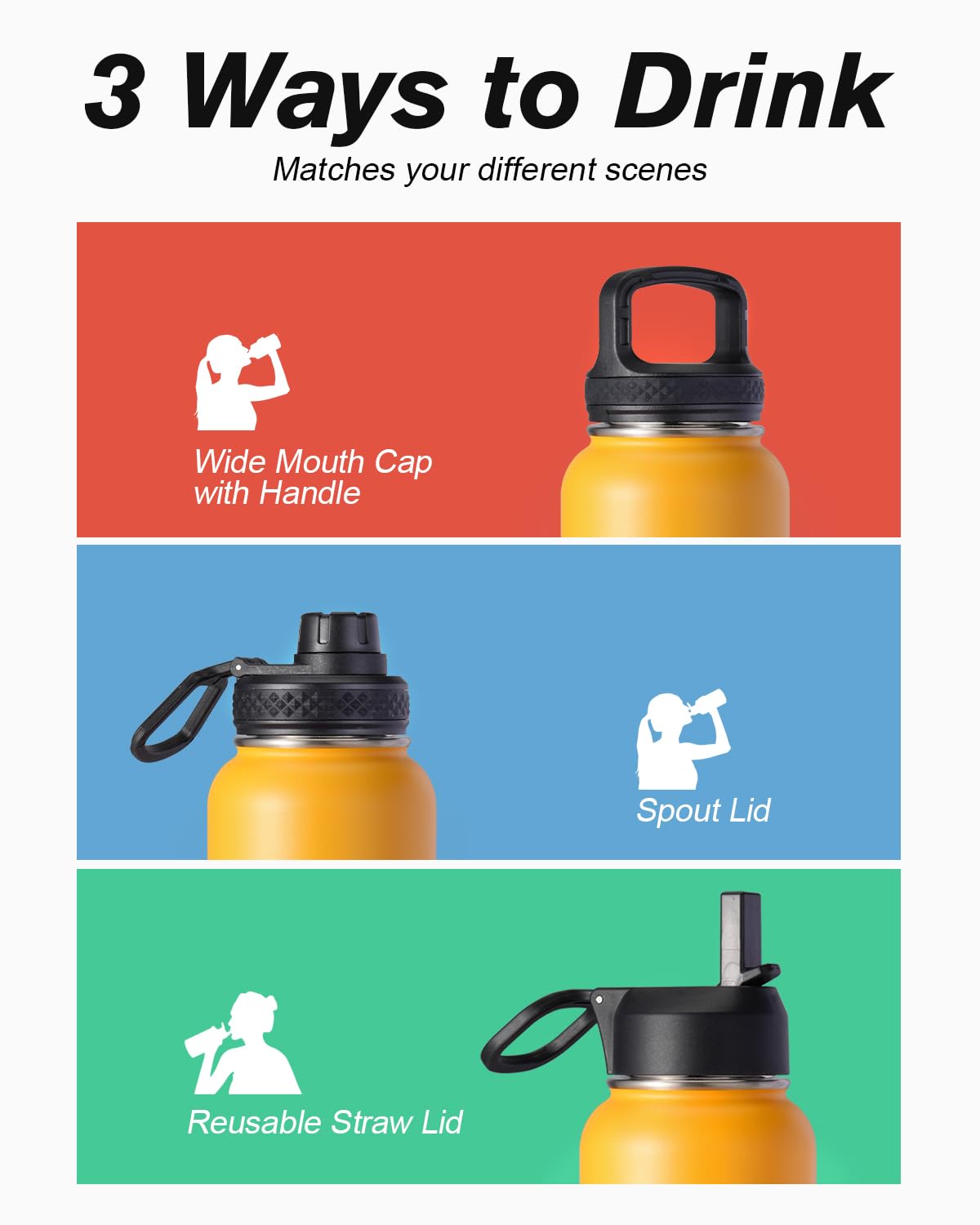 Flexible Drinking On-the-Go: This 32 oz water bottle comes with 3 different lids. The screw-on lid with flip-up handle is for easy ice refilling with superior portability; spout lid makes it convenient to drink hot liquid and straw lid for sipping cold.