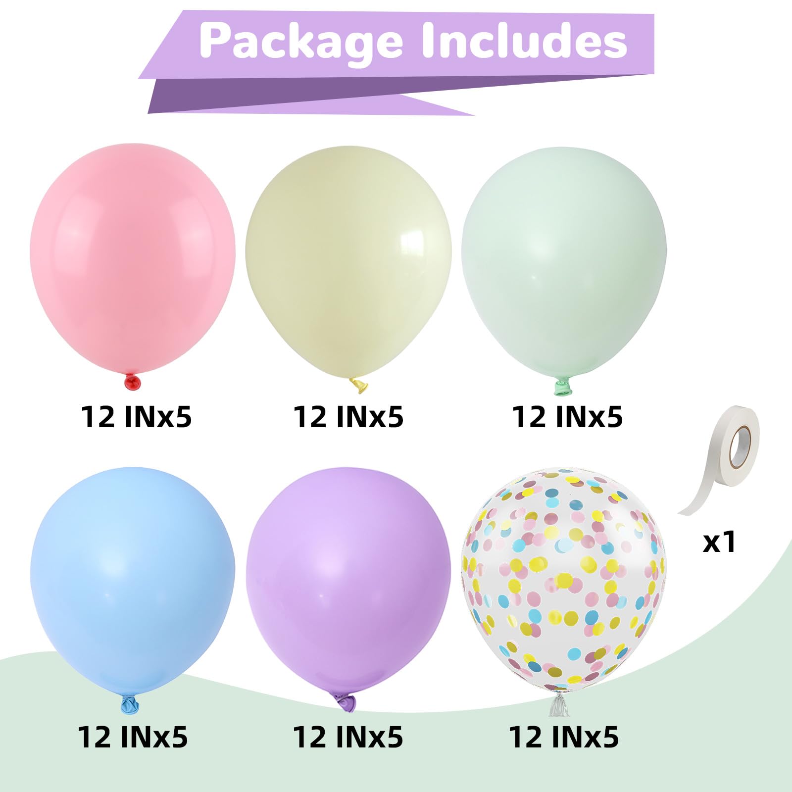 Pastel Birthday Decorations: Includes pastel pink ballons (12 inch; 5 pcs ); light yellow helium balloons (12 in; 5 pcs ); macaron green latex balloons (12 in; 5 pcs ); baby blue balloons (12 in; 5 pcs ); light purple balloons (12 in; 5 pcs ); color confetti balloon(12 in; 5 pcs ) and a roll white ribbon
