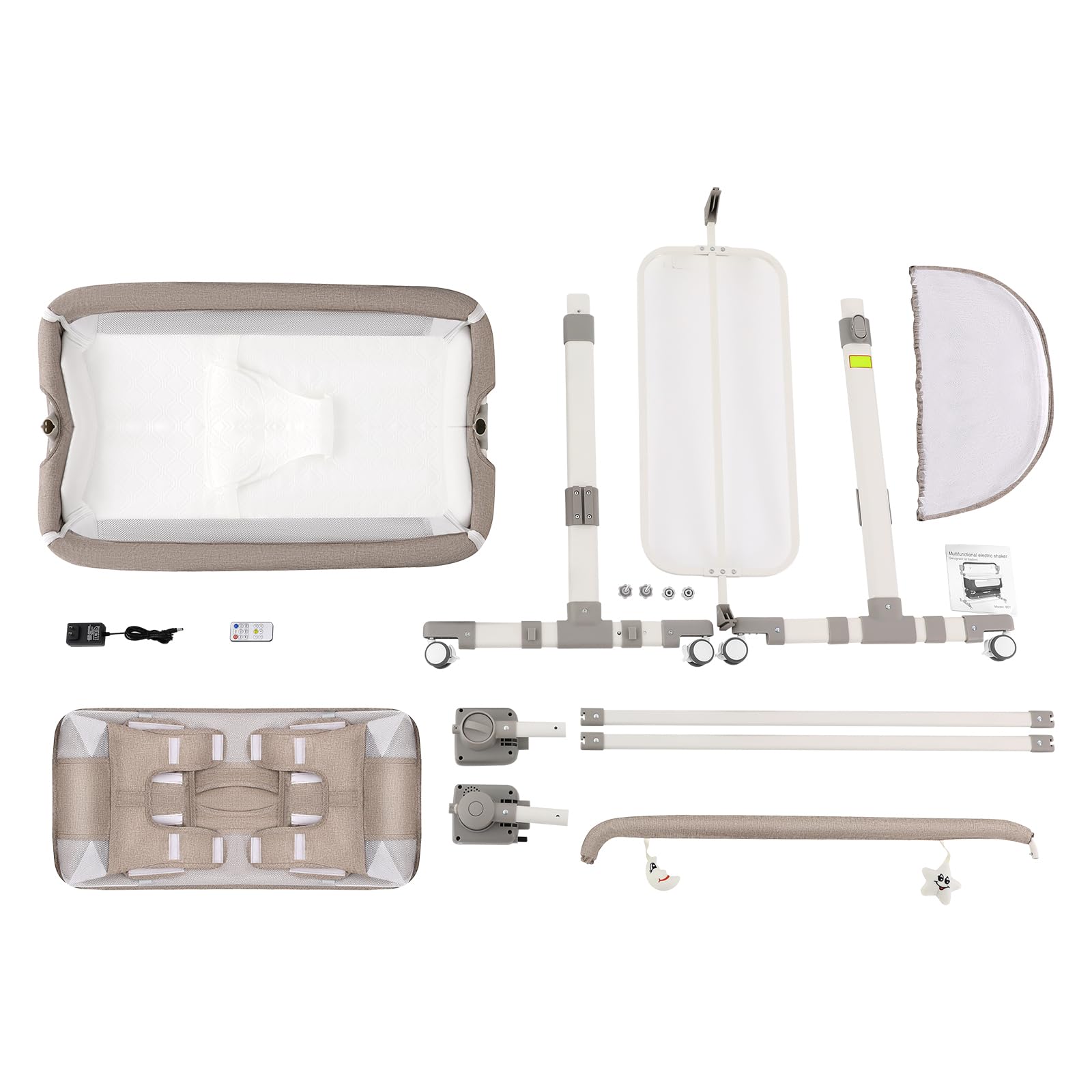 SpecificationοΌ Model: 601 Color: Khaki Material: Aluminum Alloy, Plastic, 3D Cotton Suitable Age: 0-24 Months Swinging Gear: Five Gears Timing Function: Three Adjustable Gears (8 minutes, 15 minutes, 30 minutes) Bluetooth Mode: Yes Plug: US Standard Voltage: 110V Power: 5V 2000mA Weight Capacity: 20kg/ 44lbs Height of Bed Bottom from Floor: 46-50cm/ 18.1-19.7in (Only One Gear) Product Height: 96-100cm/ 37.8-39.4in Product Width: 55-60cm/ 21.7-23.6in Product Length: 105cm/ 41.4in Package Size: 104*16*60cm/ 40.94*6.3*23.62in Net Weight: 9kg/ 19.84lbs Gross Weight: 10.5kg/ 23.15lbs DetailsοΌ Detachable Bed Surround: The detachable design allows it to be put together with your bed while also making it easy to clean. Safety Belt: The safety belt improves the safety, prevents the baby from turning over, and lets you put the baby in the cradle more safely. Soft Corners: The edges and corners of this product are smooth, and burr-free, which can effectively prevent bumps and scratches. Semi-Shade Mesh Cover: The semi-shade design not only blocks out the light but also provides privacy for your baby when changing diapers. Package IncludedοΌ 1* Smart Baby Bassinet Bedside Sleeper 1* Power Cable 1* Controller Control 1* English User Manual All Needed Accessories NotesοΌ Please allow the slight color difference caused by the shooting light and 1-3 cm error due to manual measurement, and make sure you do not mind before ordering.