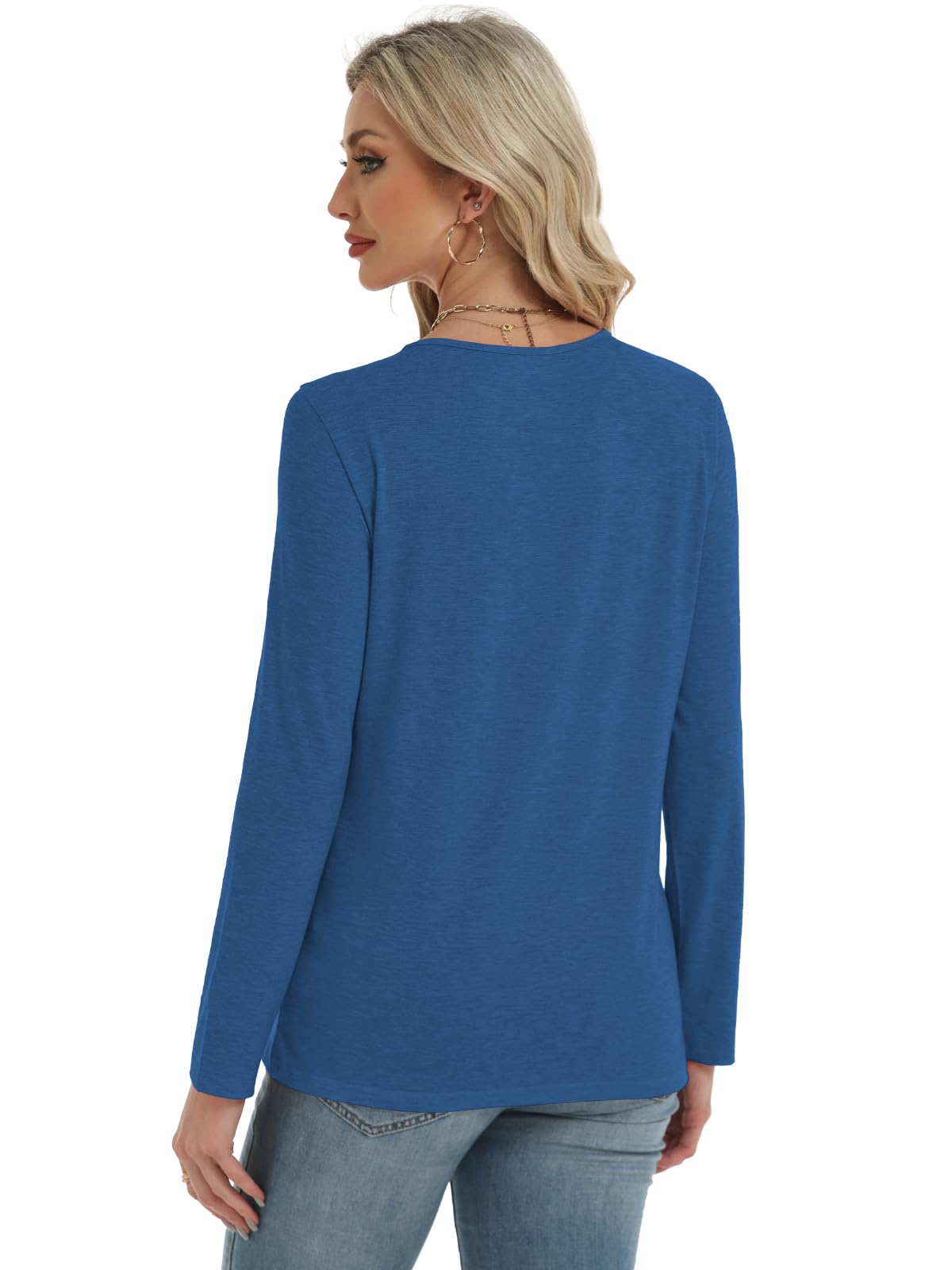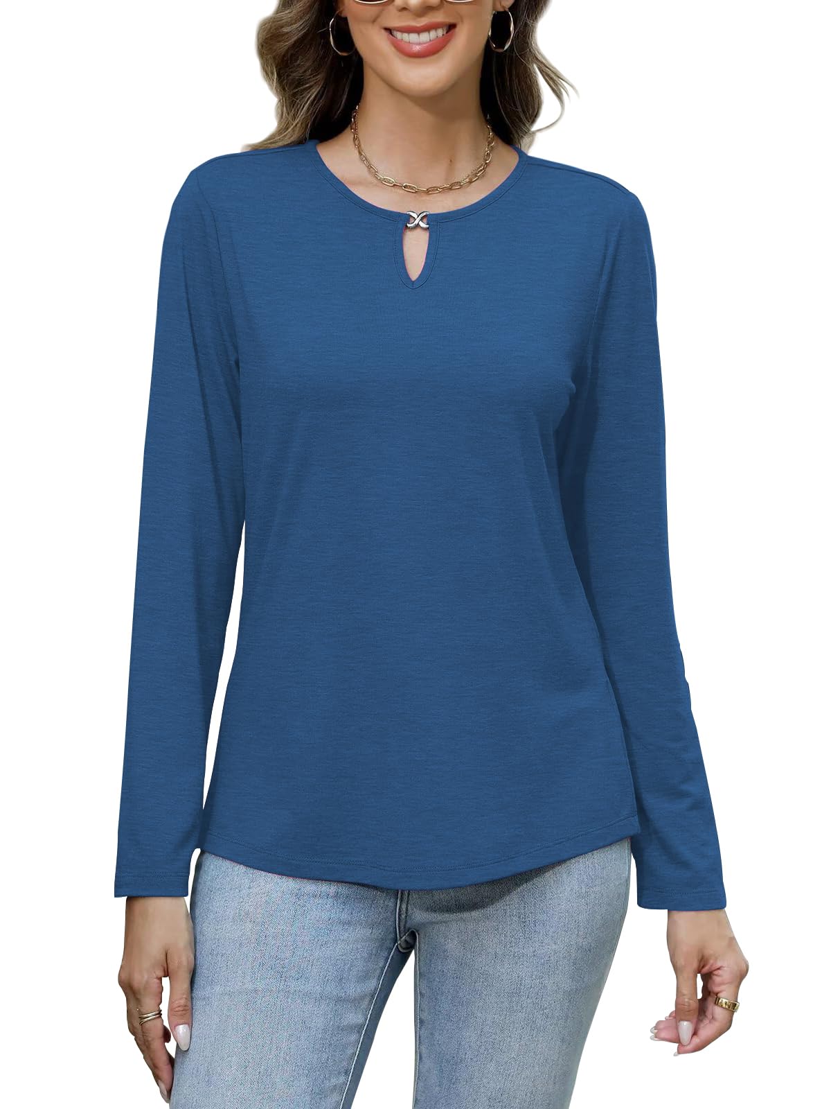 Unique Design: This elegantly designed long sleeve tops for women features a stylish round neckline with a decorative metal buckle and a slightly exposed collar, adding a touch of allure to your fall wardrobe and highlighting your personal fashion sense. loose-fitting women tops design offers a comfortable and flattering silhouette, making it ideal for casual and trendy outfits.