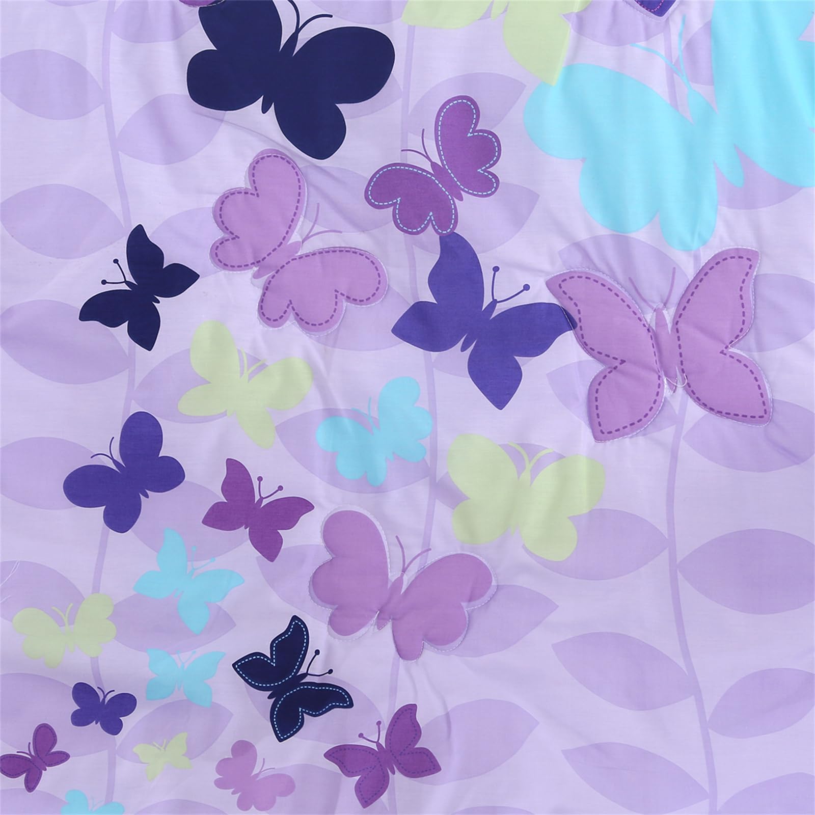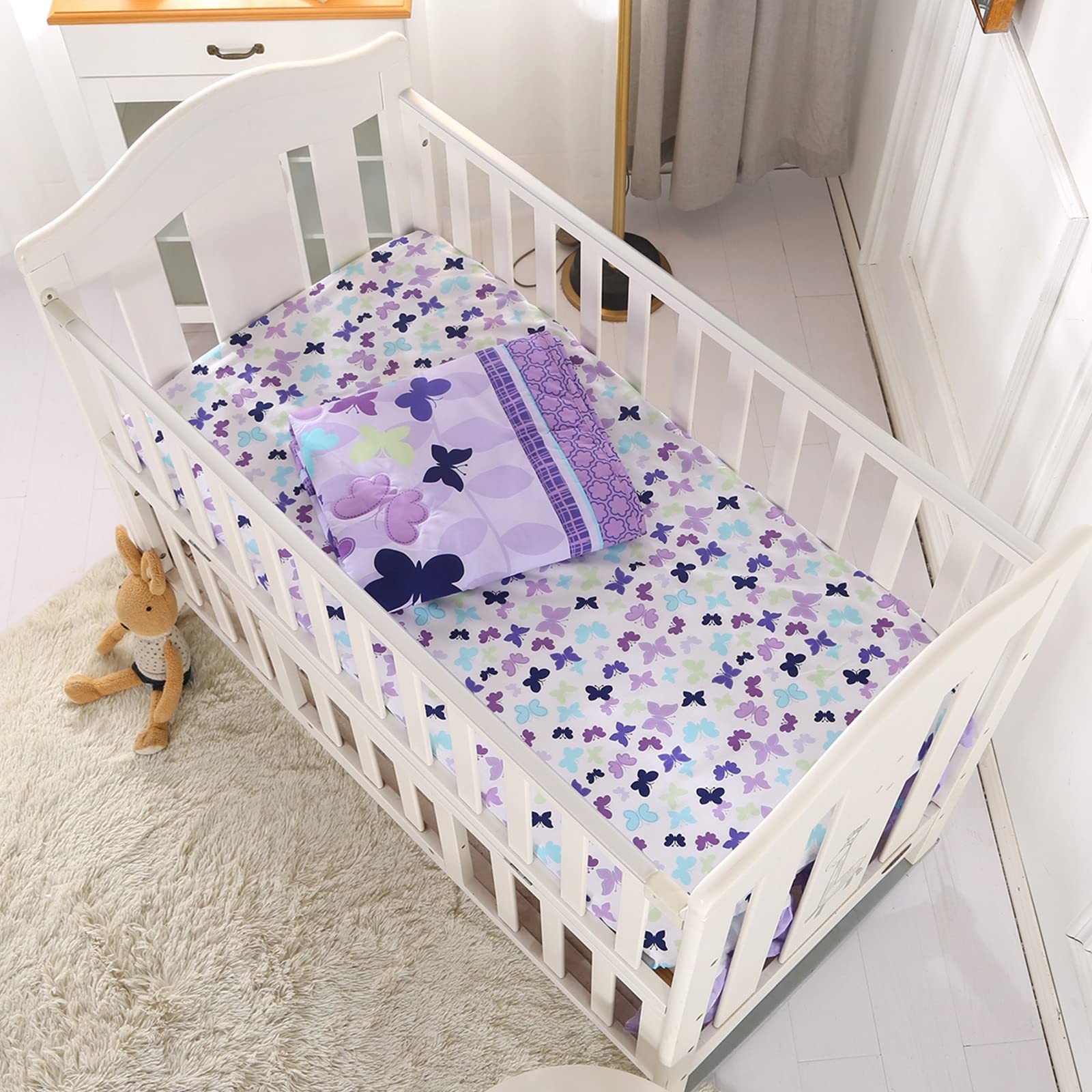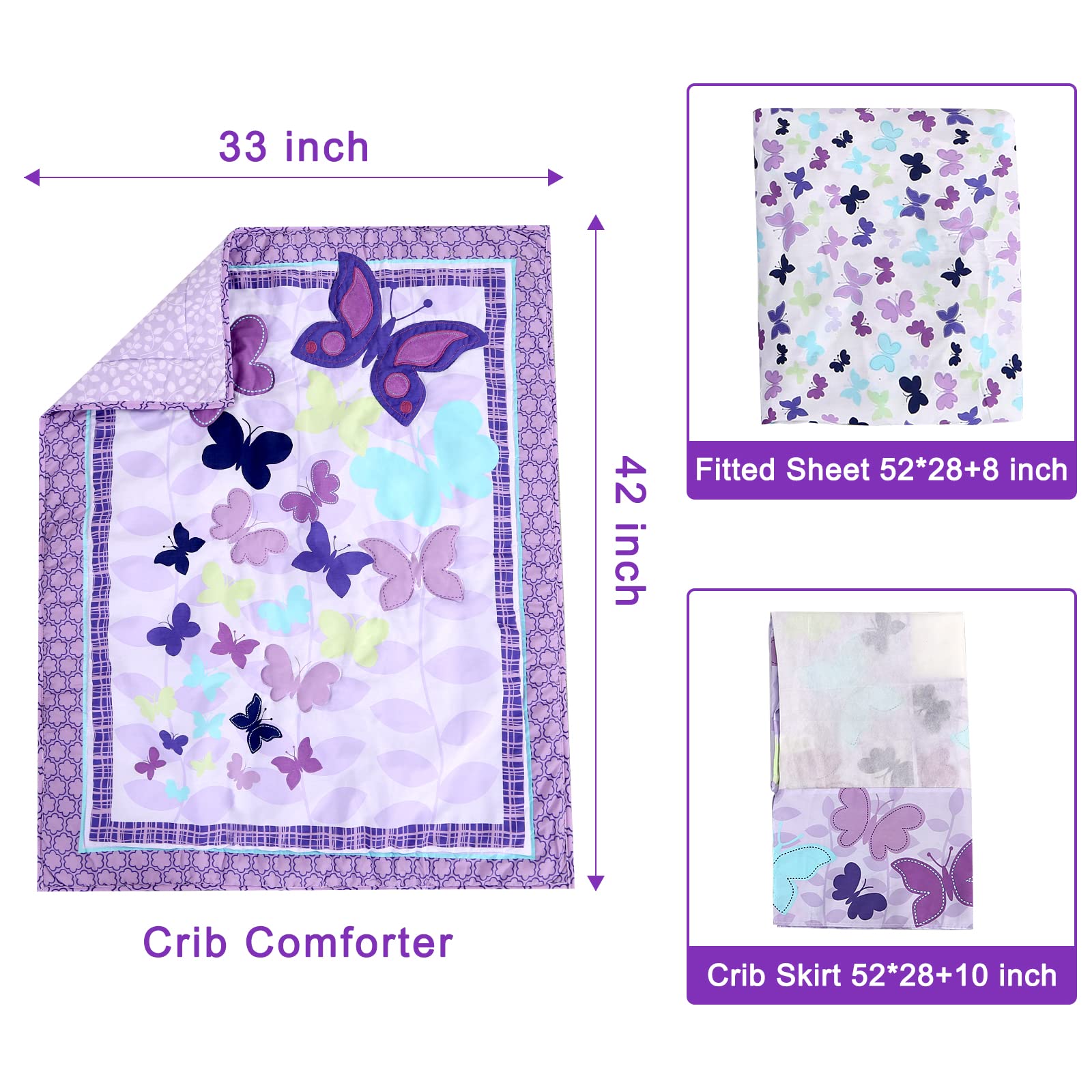 Packing List: 3 Piece purple butterfly crib bedding set includes 1 comforter (33 X 42 inch/85*107cm), 1 crib skirt (52 X 28 + 10 inch deep pockets/130*70+25cm) and 1 crib fitted sheet (52 X 28 + 8 inch drop/130*70+20cm)