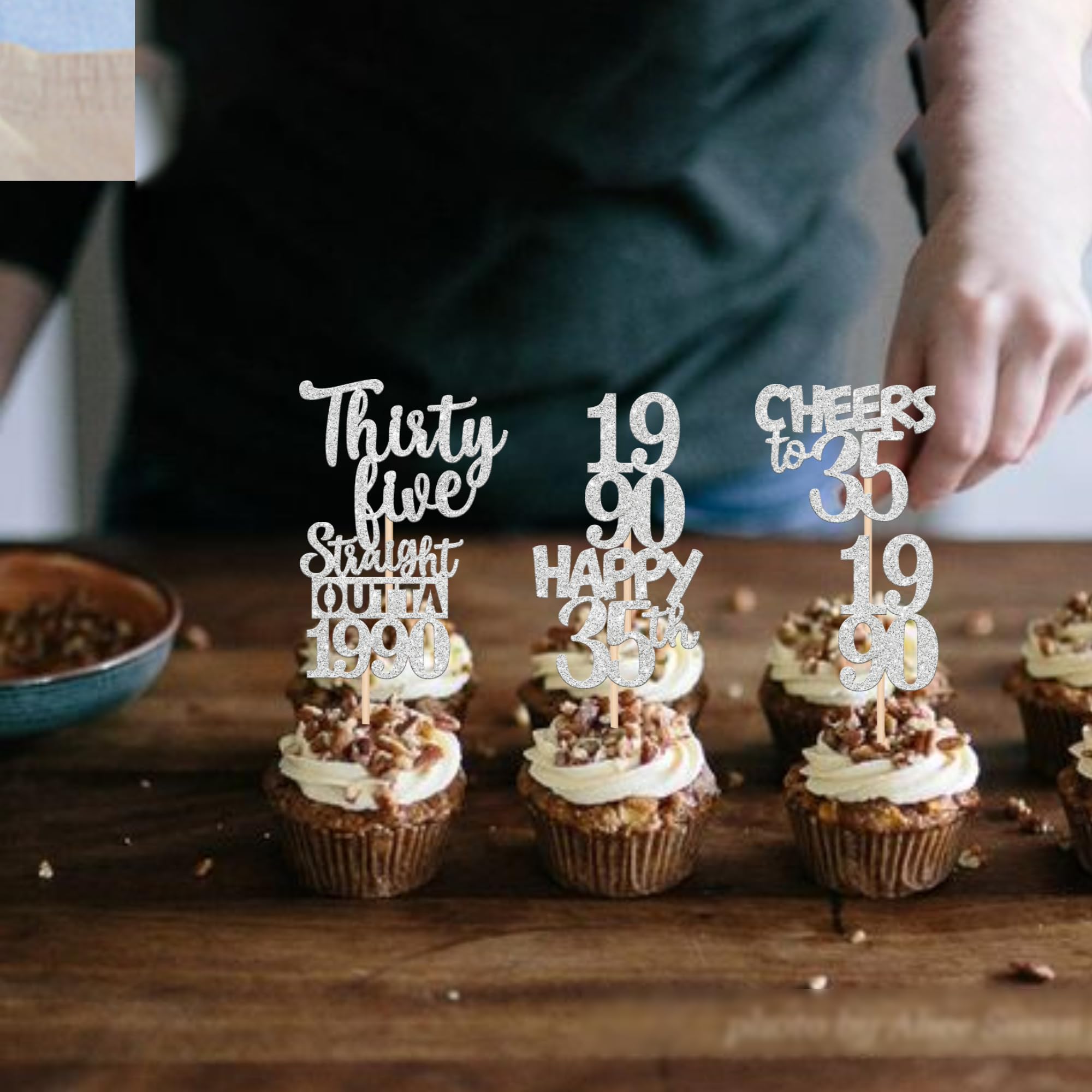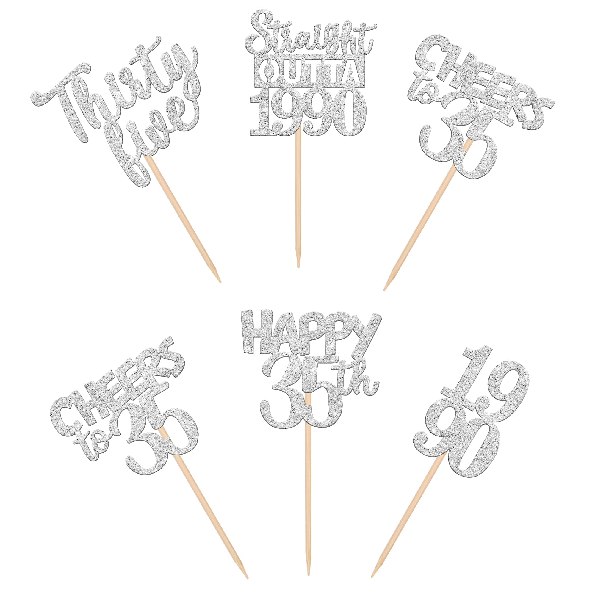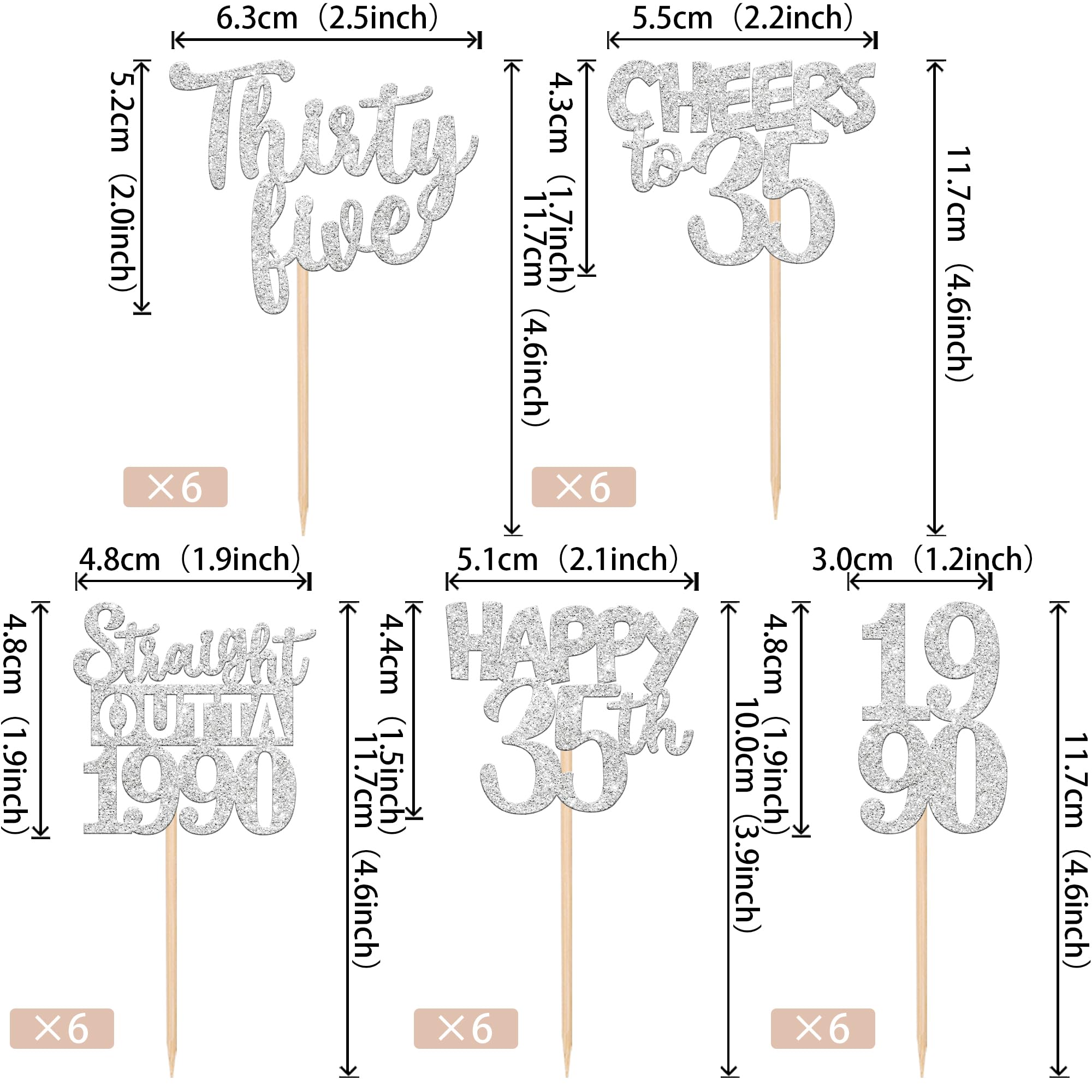 30 PCS 35th Birthday Cupcake Toppers Glitter Thirty Five Happy 35th Straight Outta 1990 Cupcake Picks for Cheers to 35 Fabulous 35th Birthday Anniversary Party Cake Decorations Supplier Silver Perfect for happy 35th bithday theme party, straight outta 1990 theme party, 35th wedding anniversary theme party,cheers to 35 years theme party cupcake decorations supplies. Pack of 30 pcs, 6 pcs of each design. The size is 2.5*4.6/ 2.2*4.6/ 1.9*4.6/ 2.1*3.9/ 1.2*4.6 inch ( with stick ) Made of high quality paper card stock,thick and sturdy. These straight outta 1990 cupcake toppers are one side glitter, another side is white, and they are intended for decoration only, please do not put them in oven or microwave. If the item you received has any defects, please contact us immediately. we will deal with it within 24 hours.