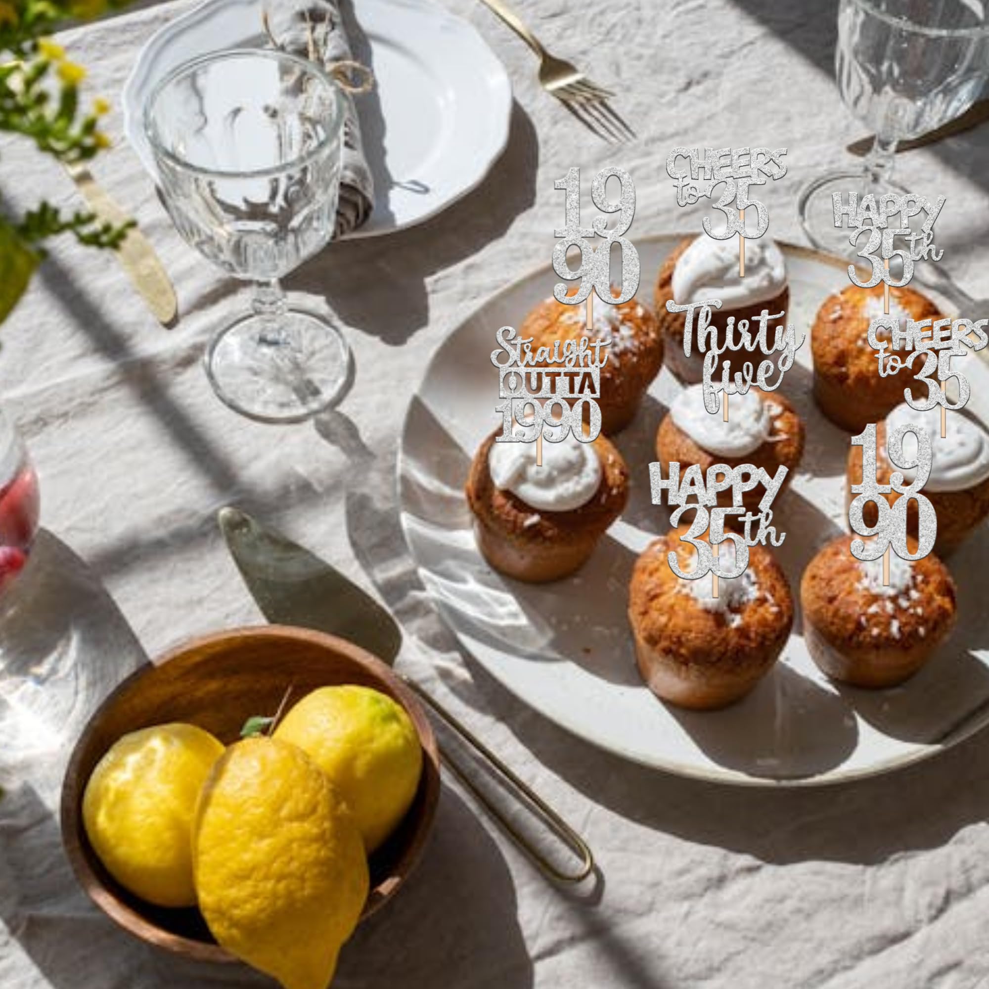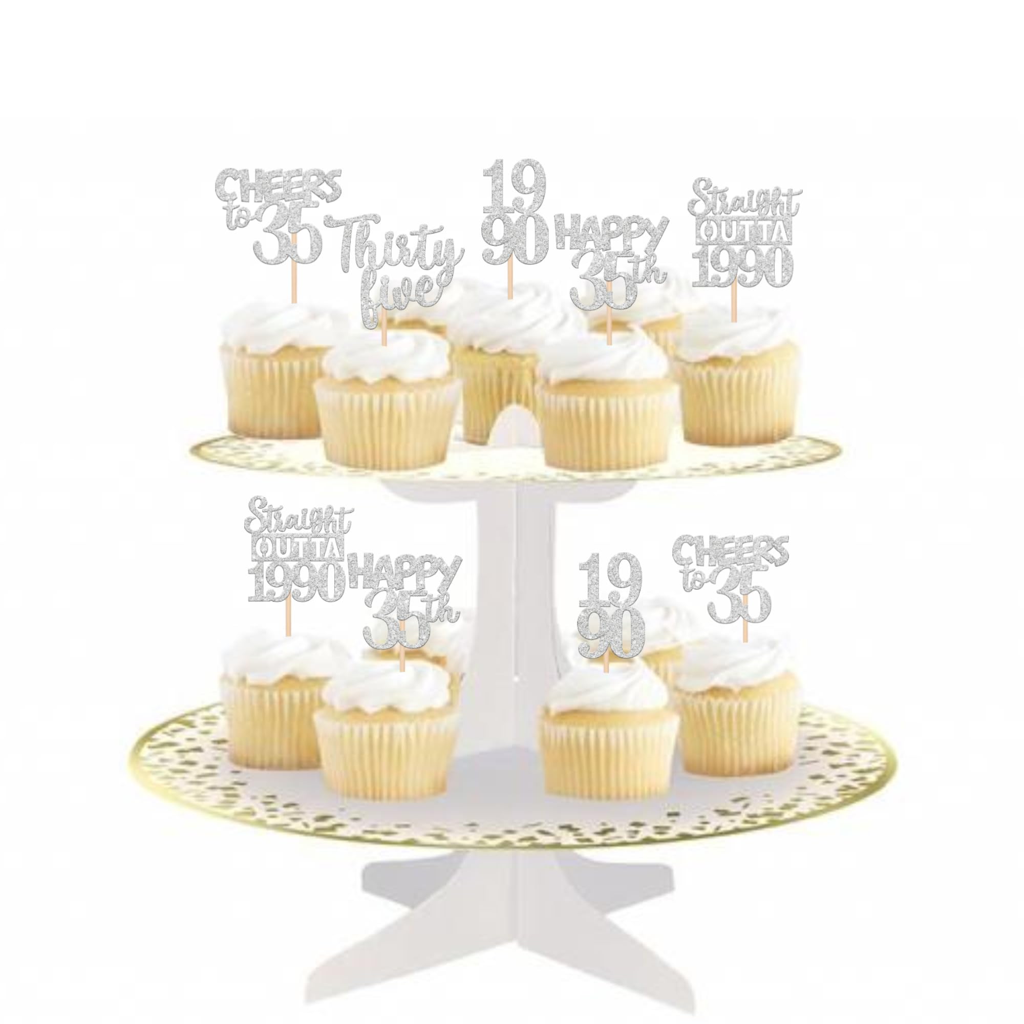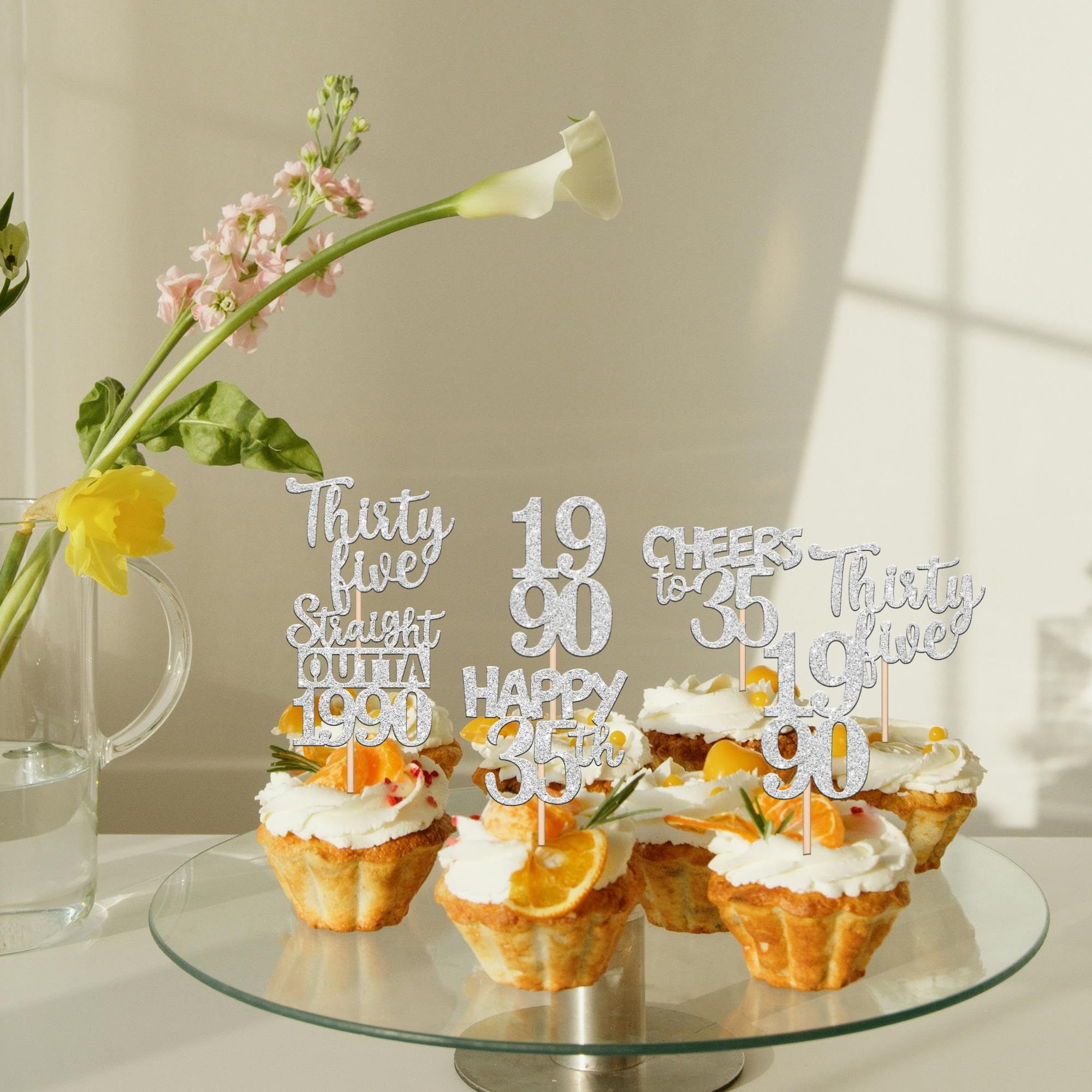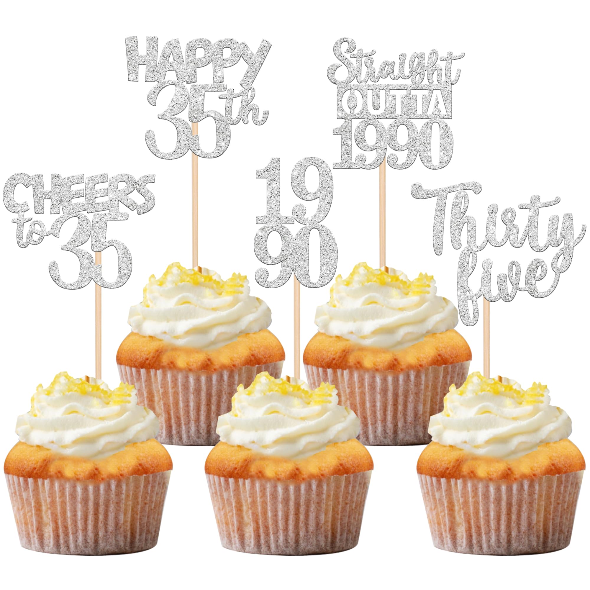 30 PCS 35th Birthday Cupcake Toppers Glitter Thirty Five Happy 35th Straight Outta 1990 Cupcake Picks for Cheers to 35 Fabulous 35th Birthday Anniversary Party Cake Decorations Supplier Silver Perfect for happy 35th bithday theme party, straight outta 1990 theme party, 35th wedding anniversary theme party,cheers to 35 years theme party cupcake decorations supplies. Pack of 30 pcs, 6 pcs of each design. The size is 2.5*4.6/ 2.2*4.6/ 1.9*4.6/ 2.1*3.9/ 1.2*4.6 inch ( with stick ) Made of high quality paper card stock,thick and sturdy. These straight outta 1990 cupcake toppers are one side glitter, another side is white, and they are intended for decoration only, please do not put them in oven or microwave. If the item you received has any defects, please contact us immediately. we will deal with it within 24 hours.