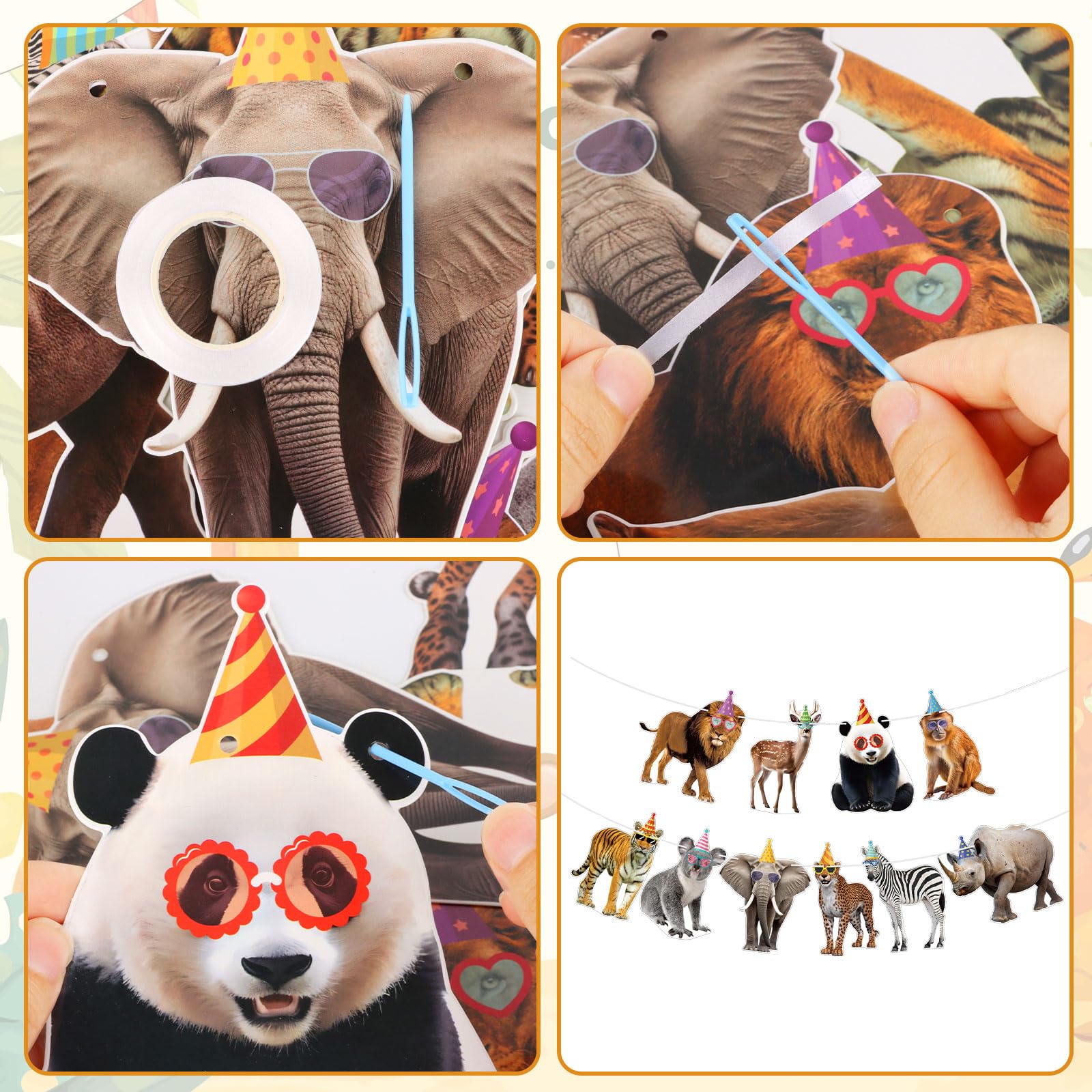 Package Includes: 10 different safari animals and a roll of ribbon, not pre-strung, please use the included plastic pins to string the ribbons with all the animals, the benefit is that you can customize the length according to the available space