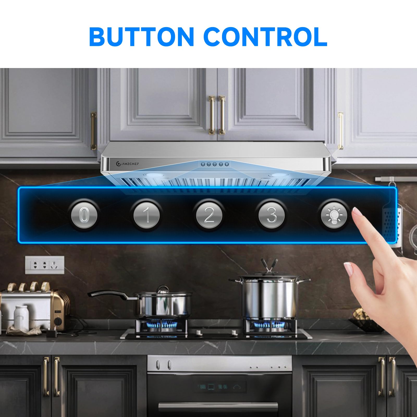 【Professional Button Controls】Intuitive tactile button interface with illuminated indicators ensures effortless operation and premium durability,AMZCHEF range hood offering precise fan speed and lighting control.