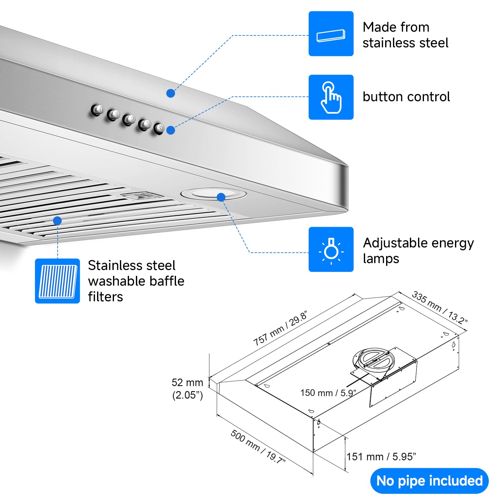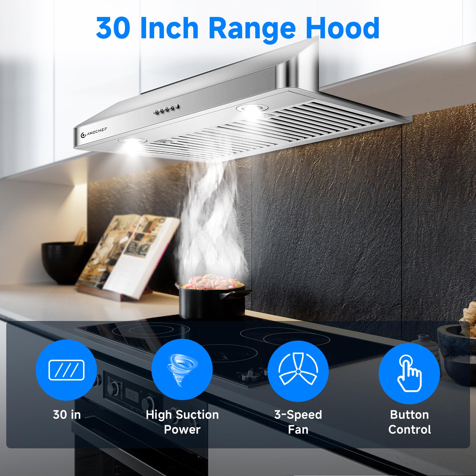 【Easy to Assemble/Disassemble】30 inch width AMZCHEF range hood matchs all modern and classic kitchens.Look concise and save space by installing it under the cabinet or wall-mounted. Kitchen extractor product size: 29.8''x19.7''x5.98''. Air outlet diameter: 6''.Support three air outlets,compatible with most standard cabinets.