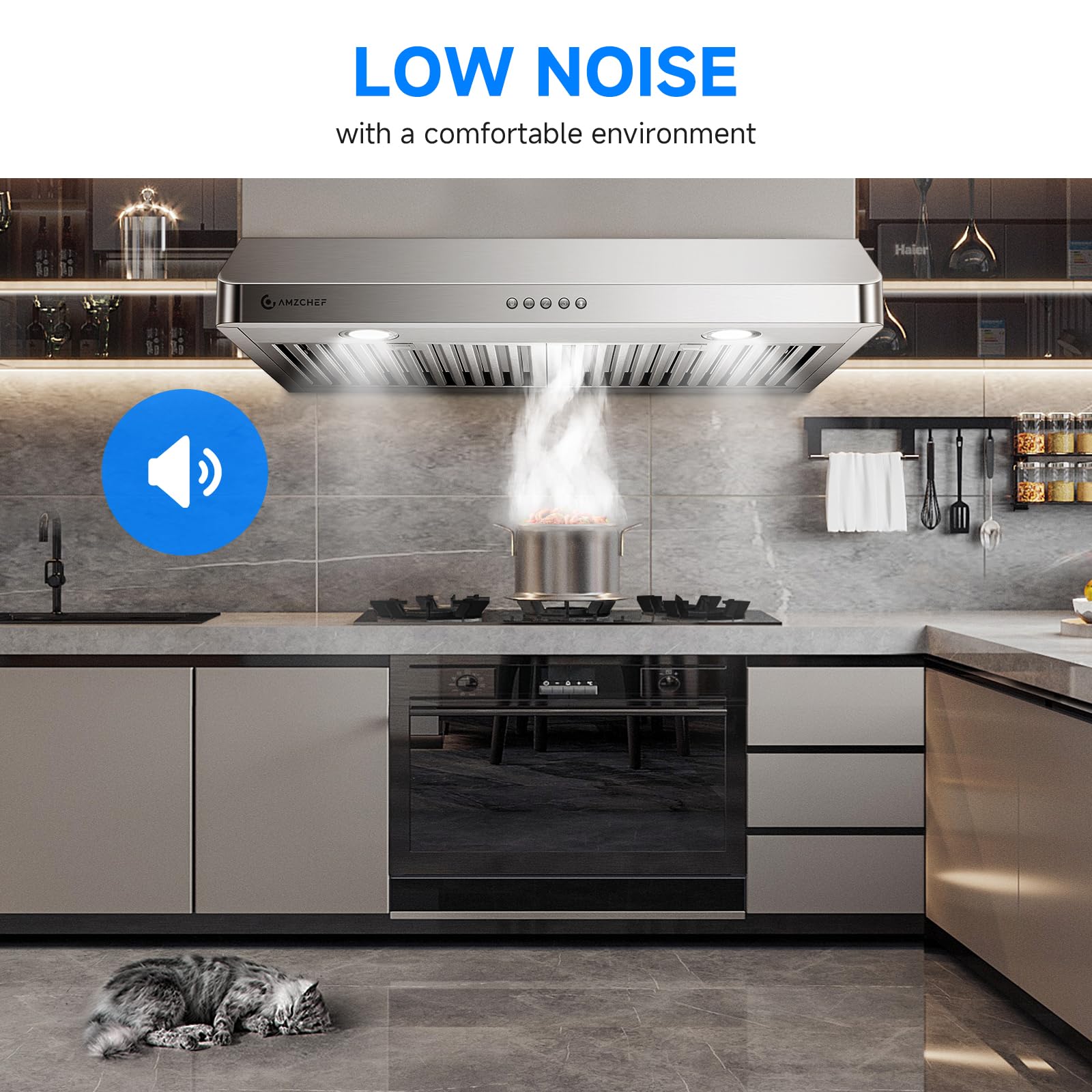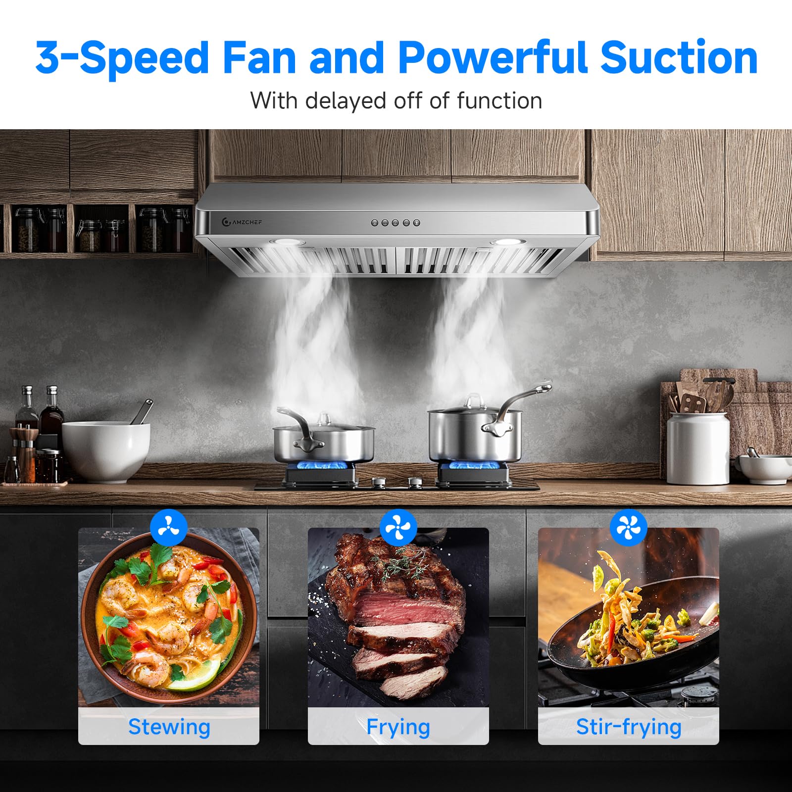【Powerful 750 CFM Extraction】AMZCHEF range hood triple-layer filtration system (aluminum mesh + baffle + charcoal) captures 98% of grease, odors, and smoke, with whisper-quiet operation at ≤60dB on low settings.