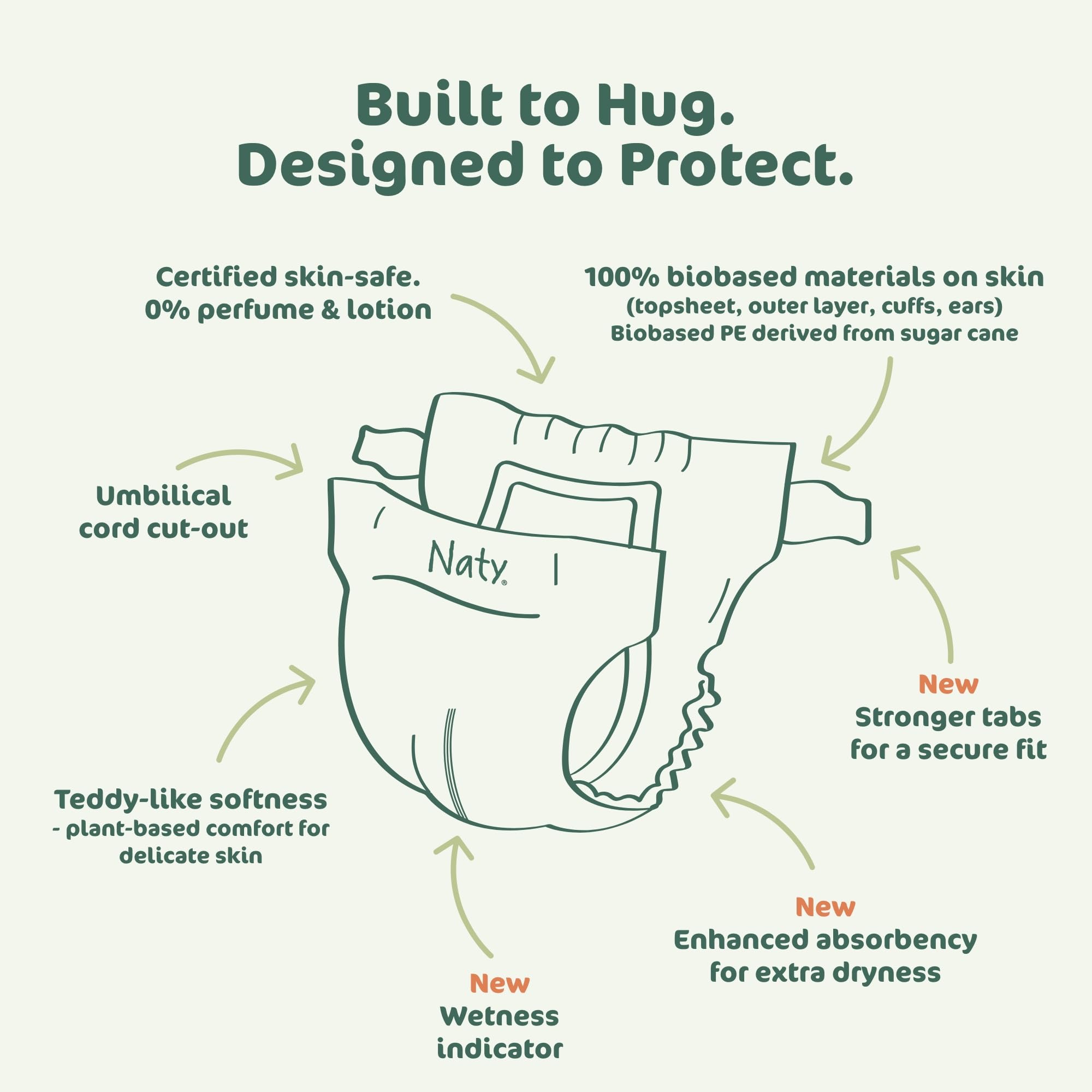 Naty BioEmbrace is our next-generation diaperโevolved from Natyโs award-winning original range to offer even better comfort, care, and absorbency. Itโs the only diaper certified 100% biobased on skin (liner, outer layer, cuffs, ears), with no fossil-based plastic in contact with your baby. Super soft from day one, its plant-based surface delivers a teddy-like touch while remaining breathable and gentle. Verified to strict safety standards against 1,000+ substances incl. chlorine, PFAS, parabens, phthalates (Oeko-Tex Standard 100). Dermatologically rated โExcellentโ by Dermatest. Vegan, FSC-certified, and developed in Sweden since 1994. Size 1 includes umbilical cord cut-out. Available in sizes 1โ6 for comfort from newborn to toddler. Previously Eco by Natyโnow simply Naty.