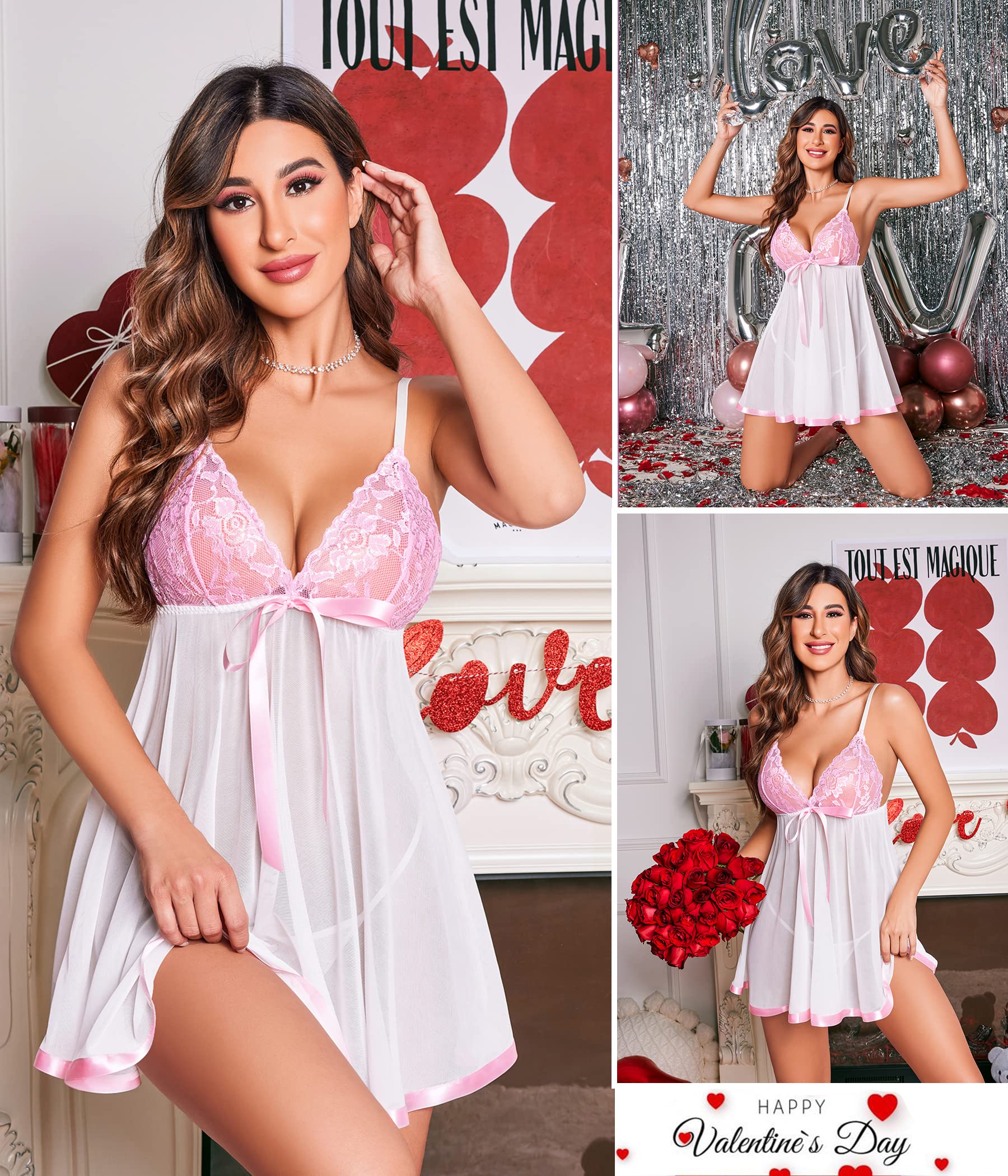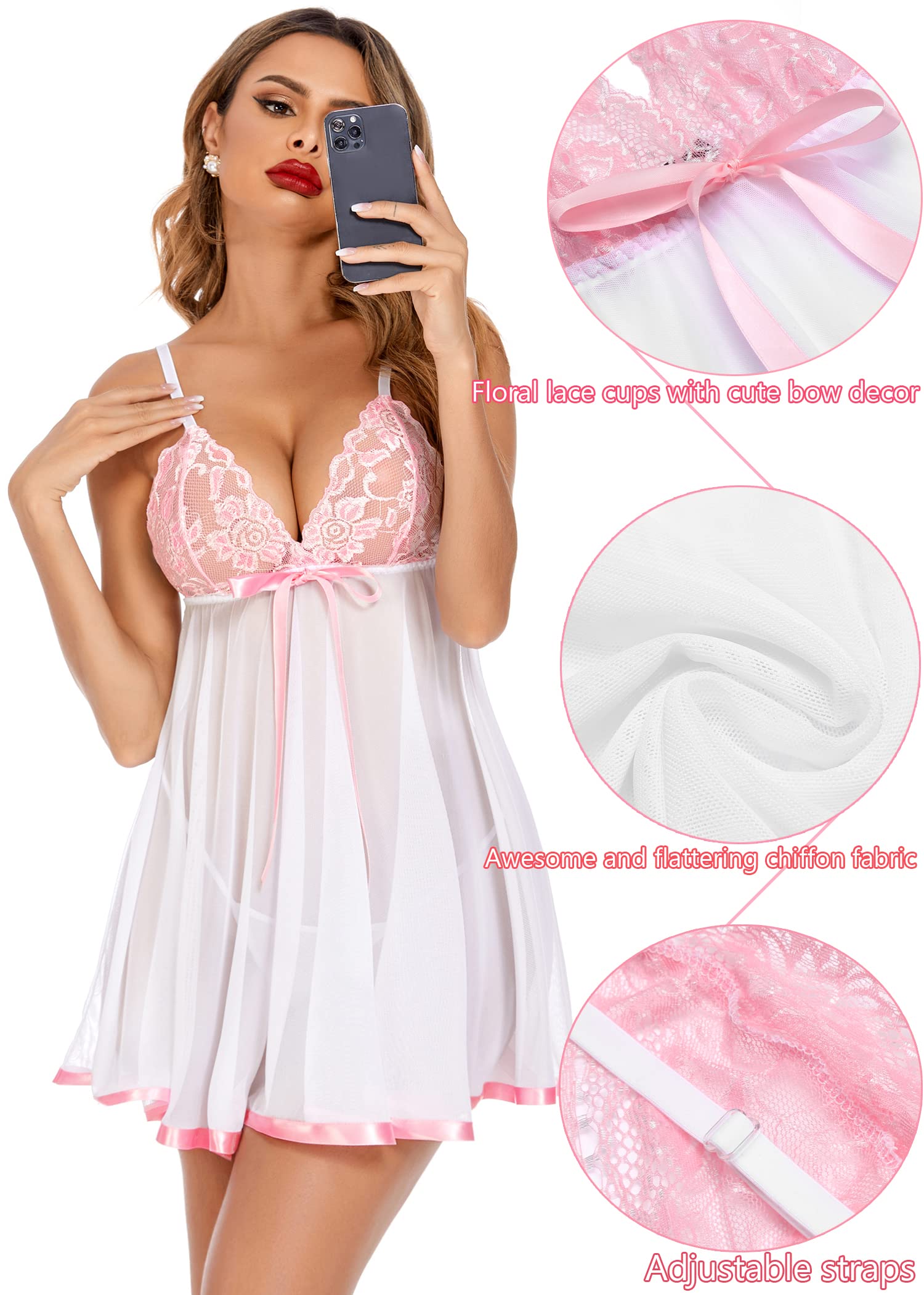 The Avidlove babydoll set features lace cups with a v-neck, adjustable spaghetti straps and a sheer mesh mini skirt with a satin trim
