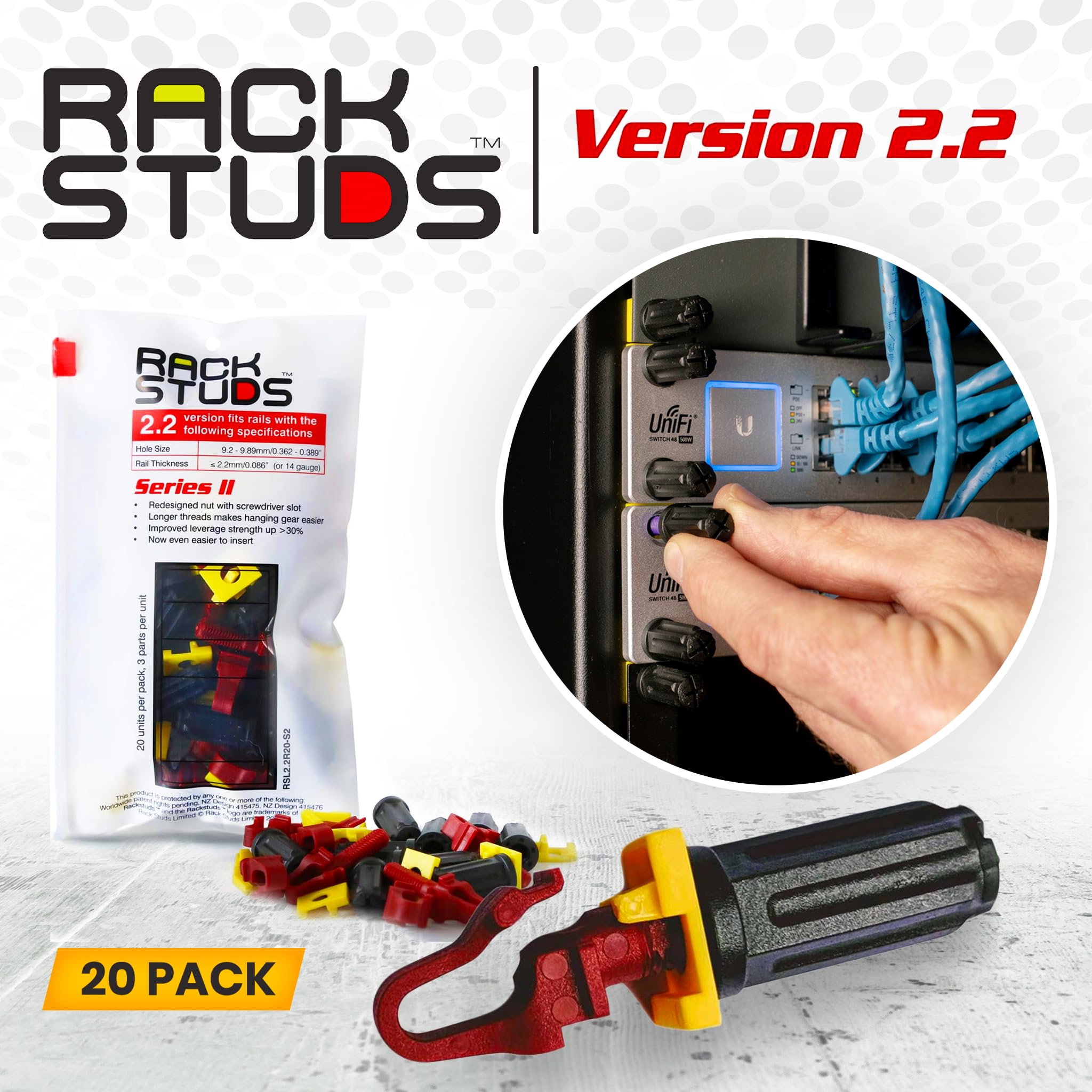VERSATILE COMPATIBILITY: The red Rackstuds are designed for rails up to 2.2mm/0.086" thick, making them the ideal solution for most standard racks. For rails thicker than 2.2mm/0.086", simply opt for the new purple version for a great fit. This ensures you have the right tool for any job, no matter your rack rails specifications.