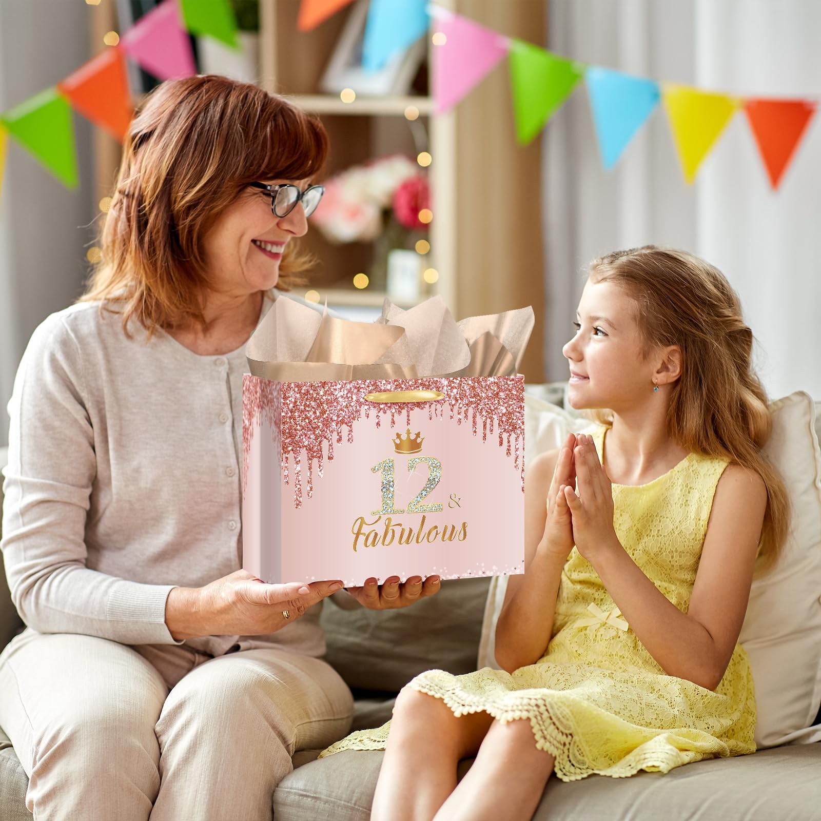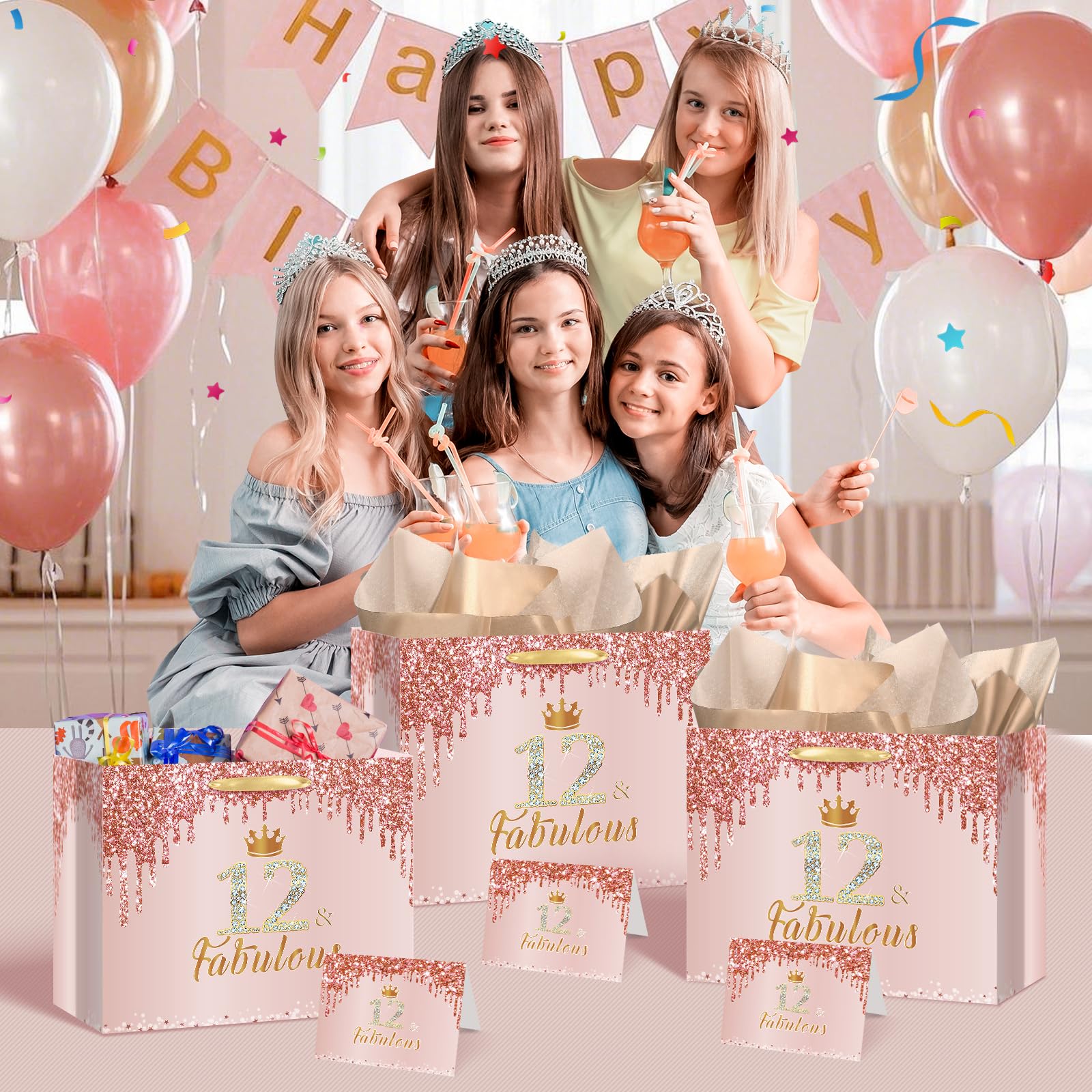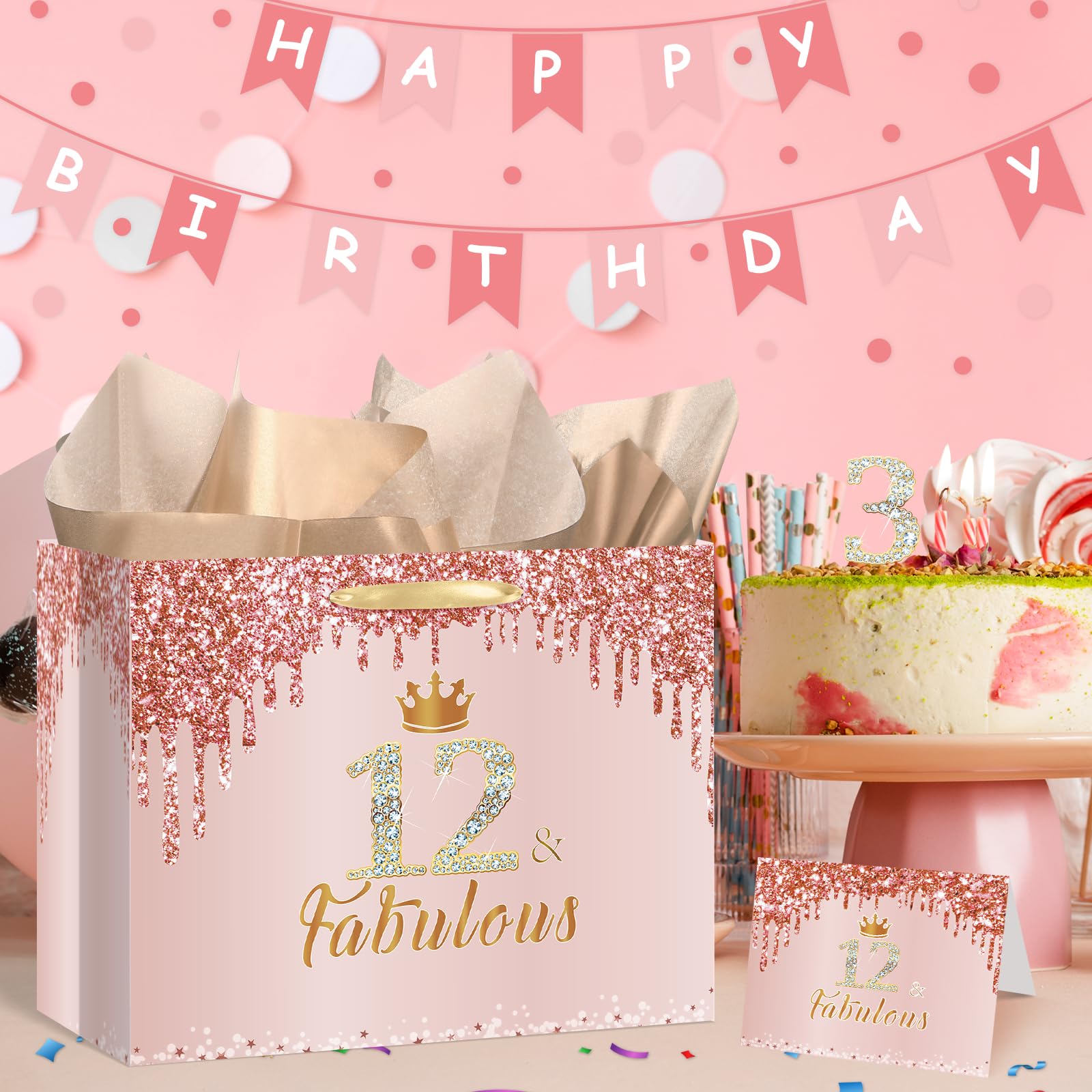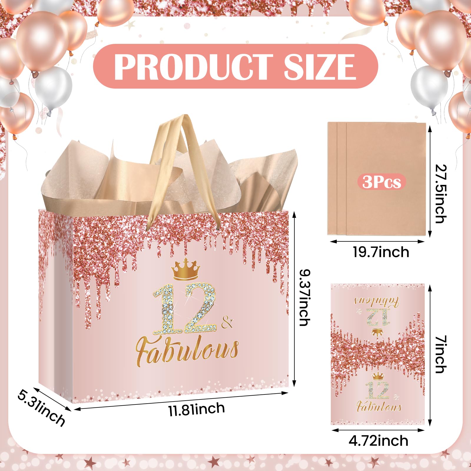🎁【Large Size and Durable Material】The large pink 12th birthday gift bag for girls is 12.8"x 9.4"x 5.3", which is big enough to hold most gifts of your choice. The 12th birthday greeting card is 4.7"x 7" and the rose gold 12th wrapping tissue paper is 27.5"x 20". The material of this rose gold 12th birthday wrap bag is thick paper, which is strong and durable.