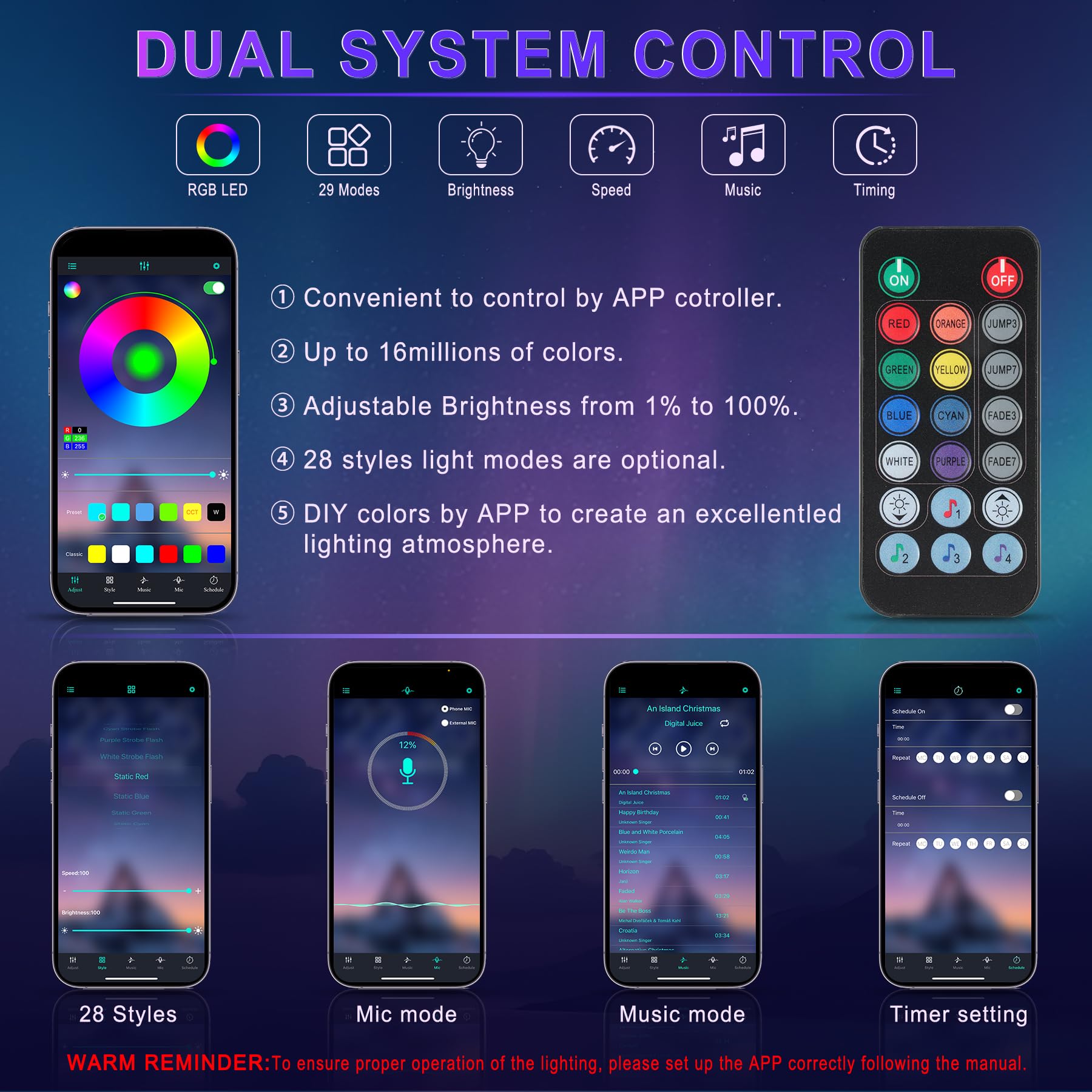 Dual Control System:This car ambient lighting kit will revolutionize your car space! Control your interior car lights through mobile app and remote controller, whether it is switching on/off the led, adjusting the brightness, or selecting your favorite hue from 16 million colors, all at your fingertips.29 dynamic modes to switch as you wish, support music rhythm and timer function, so that your led strip light change freely according to your moods and rhythms.