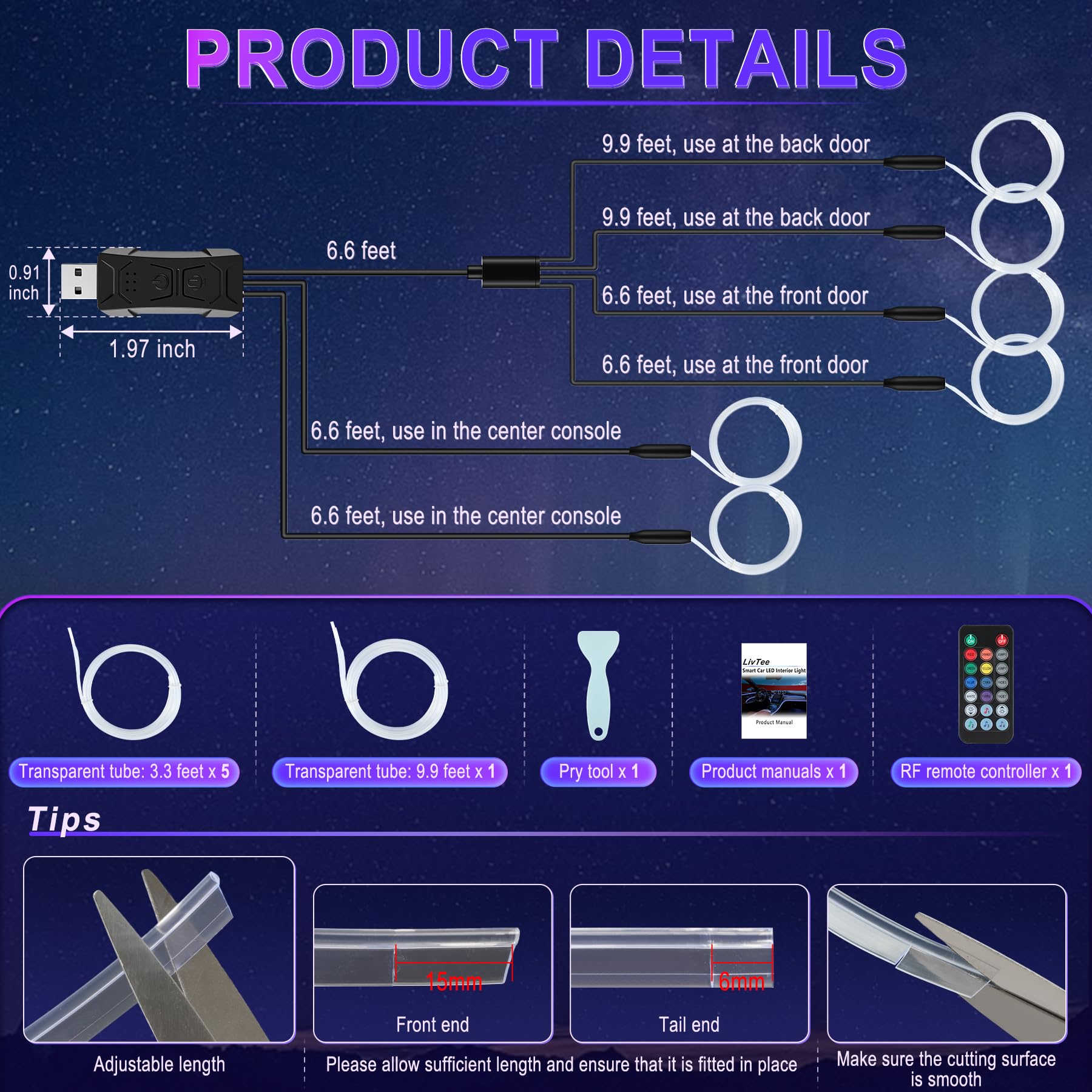 Transparent Tubes: Car led lights interior wireless kit, contains 6 bundles of transparent tubes (5 x 3.3-feet + 1 x 9.9-feet), which can be easily connected to LED light sources. The flexible material can be freely bent and cut, with excellent light guiding performance, the light is even and soft without glare. Simply trim the end and insert the black sealing plug for perfect light effect!