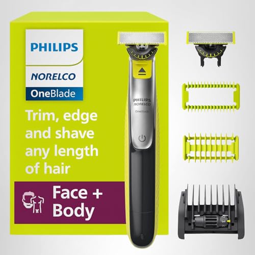 The Philips Norelco OneBlade 360 Face + Body is a revolutionary new hybrid hair removal device for men that can shave and create clean lines and edges, on any length of hair. Forget about using multiple steps and tools. OneBlade does it all. Its shaving technology features a fast-moving cutter that moves up to 12,000x per minute and powers through any length of hair. The dual-protection system, a glide coating combined with rounded tips, makes shaving easier for even more comfortable hair removal. The innovative 360 Blade moves in all directions and adjusts to every curve of your face and body to maintain constant skin contact, while enabling control at all times. Easily trim & shave, even the most difficult-to-reach areas with fewer passes and greater comfort¹. Create precise edges with the dual-sided blade. You can shave in either direction to get great visibility and see every hair that you're cutting. Line up your style in seconds! This hair trimmer for men doesn't shave as close as a traditional blade - so your skin stays safe and comfortable. Unique 5-in-1 open comb design provides an efficient trim without clogging and interrupting your routine, even on long and thick hair. You also get an extra original blade with a body comb (3mm) and a skin guard for your body and sensitive areas. Manscape with ease and comfort! OneBlade is fully waterproof, so it's easy to clean. Just rinse it under the tap. You can also use it wet or dry, with or without foam, creams, gel, or in the shower, making this a great trimmer/razor choice for men. Time to get your perfect facial style and stubble. Stainless steel blade lasts up to 4 months of use² to keep that fresh feel. An eject icon will appear on the blade when it's time to consider changing the blade for the best shaving experience. Fully rechargeable, the OneBlade 360 Face + Body delivers 60 minutes of continuous shaving power after a 4-hour charge. USB-A charging cable included (wall power adapter not included). ¹ vs. its predecessor while shaving ² Replace every 4 months for the best shaving experience. Based on 2 full shaves per week. Actual results may vary. ³2 + 3 years warranty upon registration within 90 days on Philips.com or in the OneBlade app