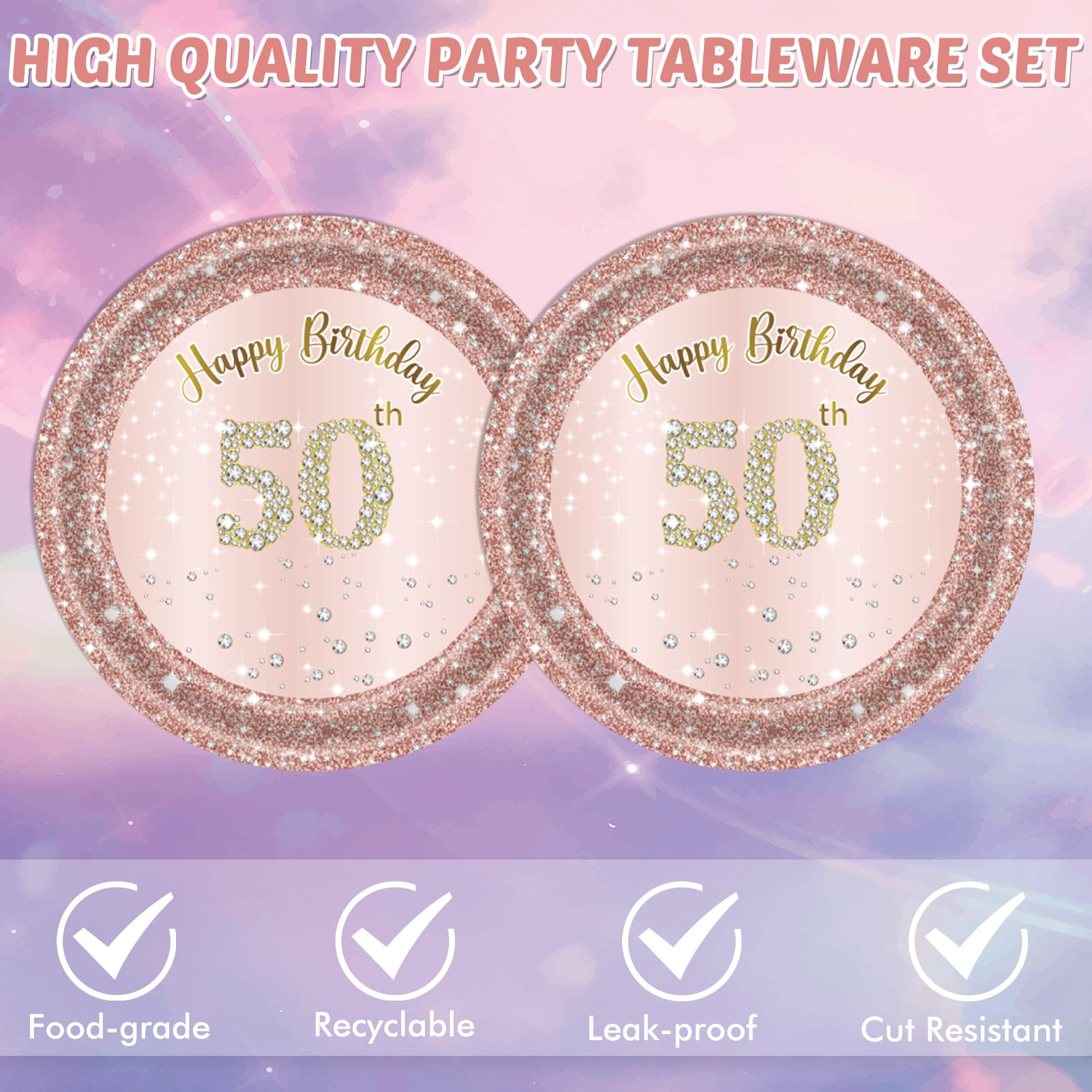 [About Us:] Company: We are a company specializing in providing party party supplies, including Party tableware, Birthday Hanging Swirls,Birthday Cupcake Toppers,party decorations and other party supplies. We provide attractive product design and the best quality at the most reasonable price for our customers! Team: We have a professional, young team of designers, our team is good at designing creative party supplies to bring happiness to people and create more perfect party supplies, please choose a professional for making happiness. [Why choose us:] High quality "50th birthday party supplies" makes party planning stress-free and gives guests a fresh feeling Affordable price for maximum pleasure at minimum price Food grade material is safe, healthy and environmentally friendly [What you will get:] 20 50th birthday cake plates 20 50th birthday rose gold napkins [Attention:] Do not reheat in the microwave oven to prevent danger