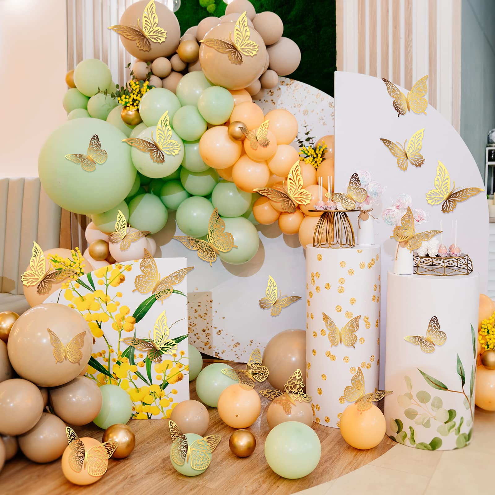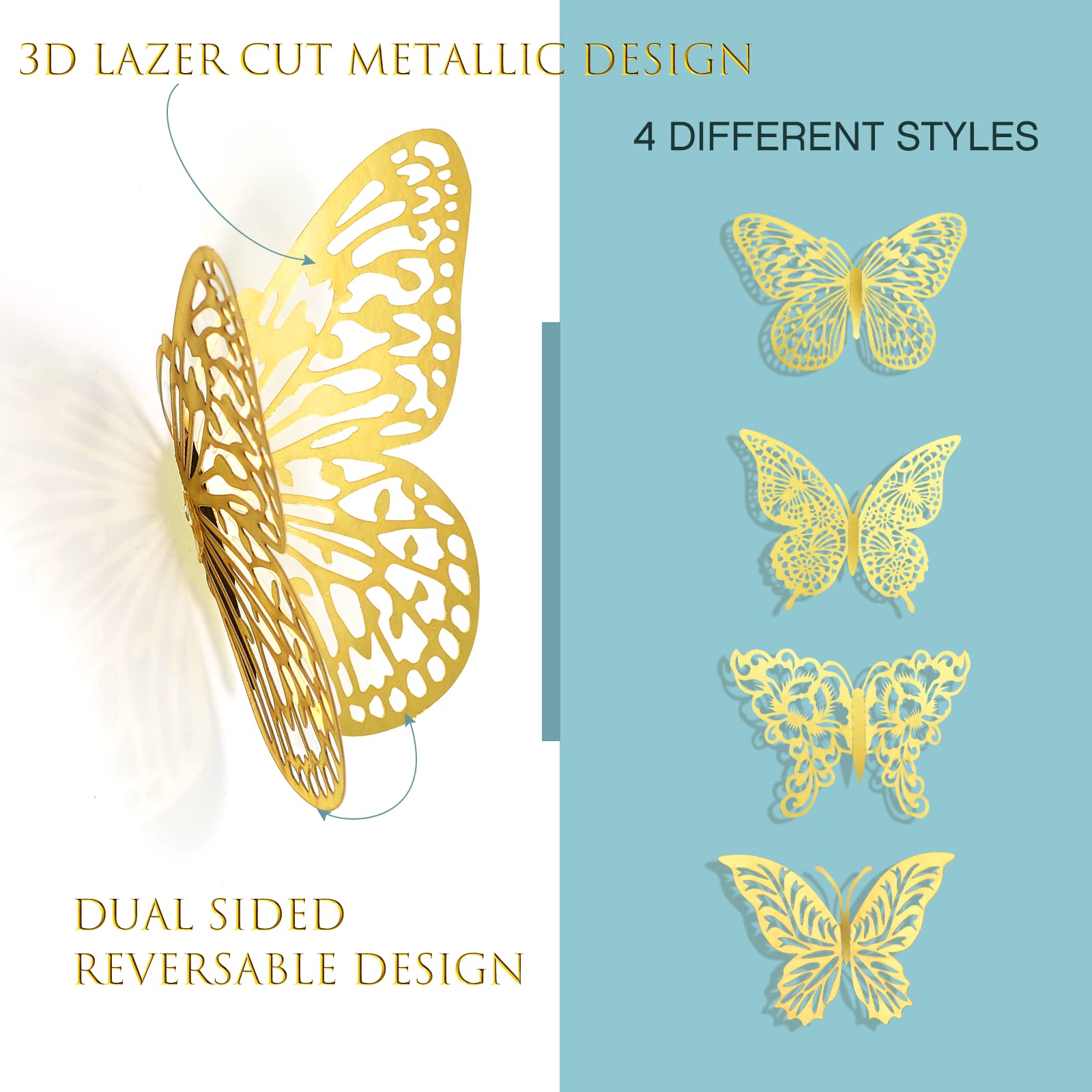 What You Get - 48pcs new design metallic butterfly decors in 4 styles. Each style has 3 sizes in 12cm (4.72) of large, 10cm (3.93”) of medium and 8cm (3.15”) of small, and every size have 4 pieces. The package also contains 48 pieces of removable double-sided adhesive.