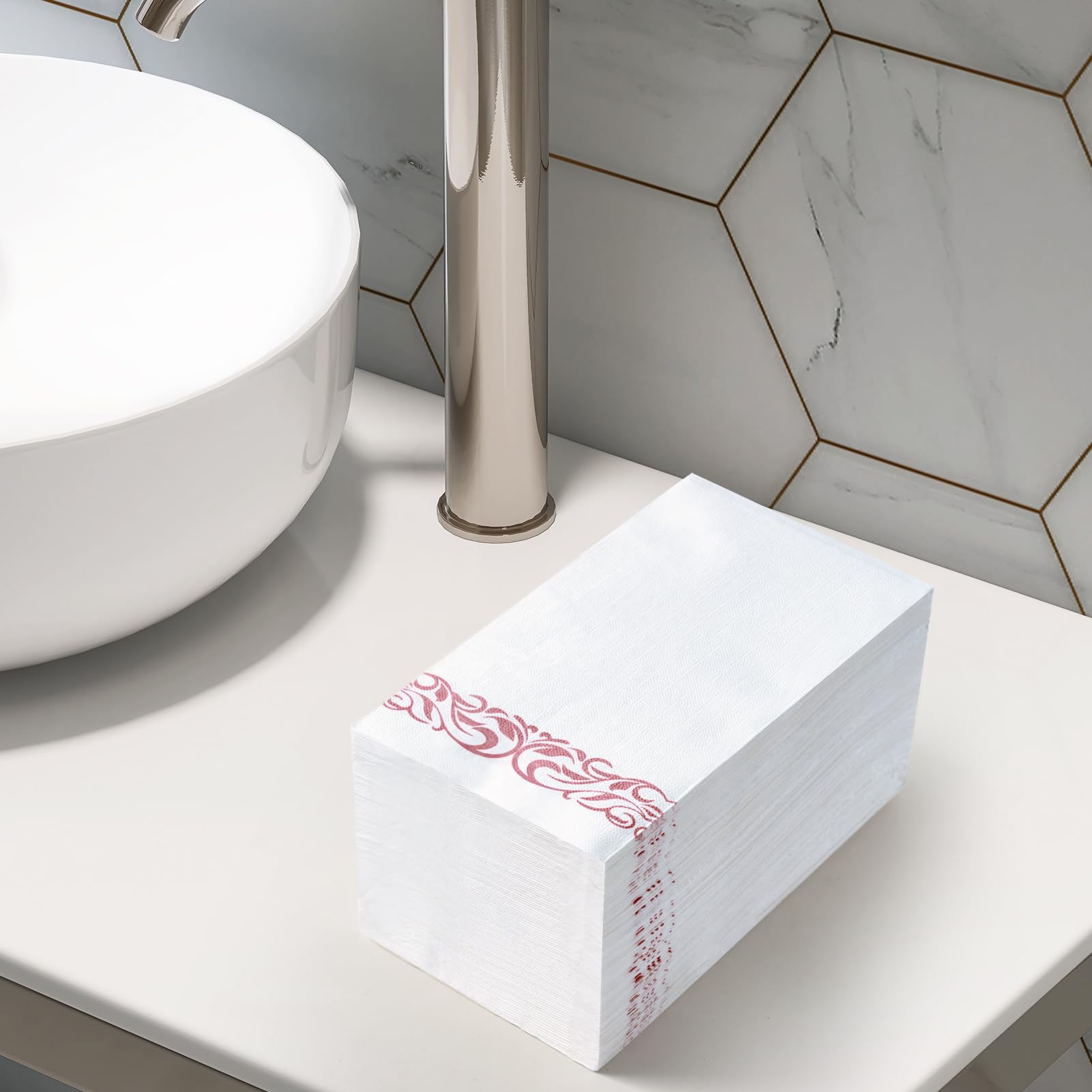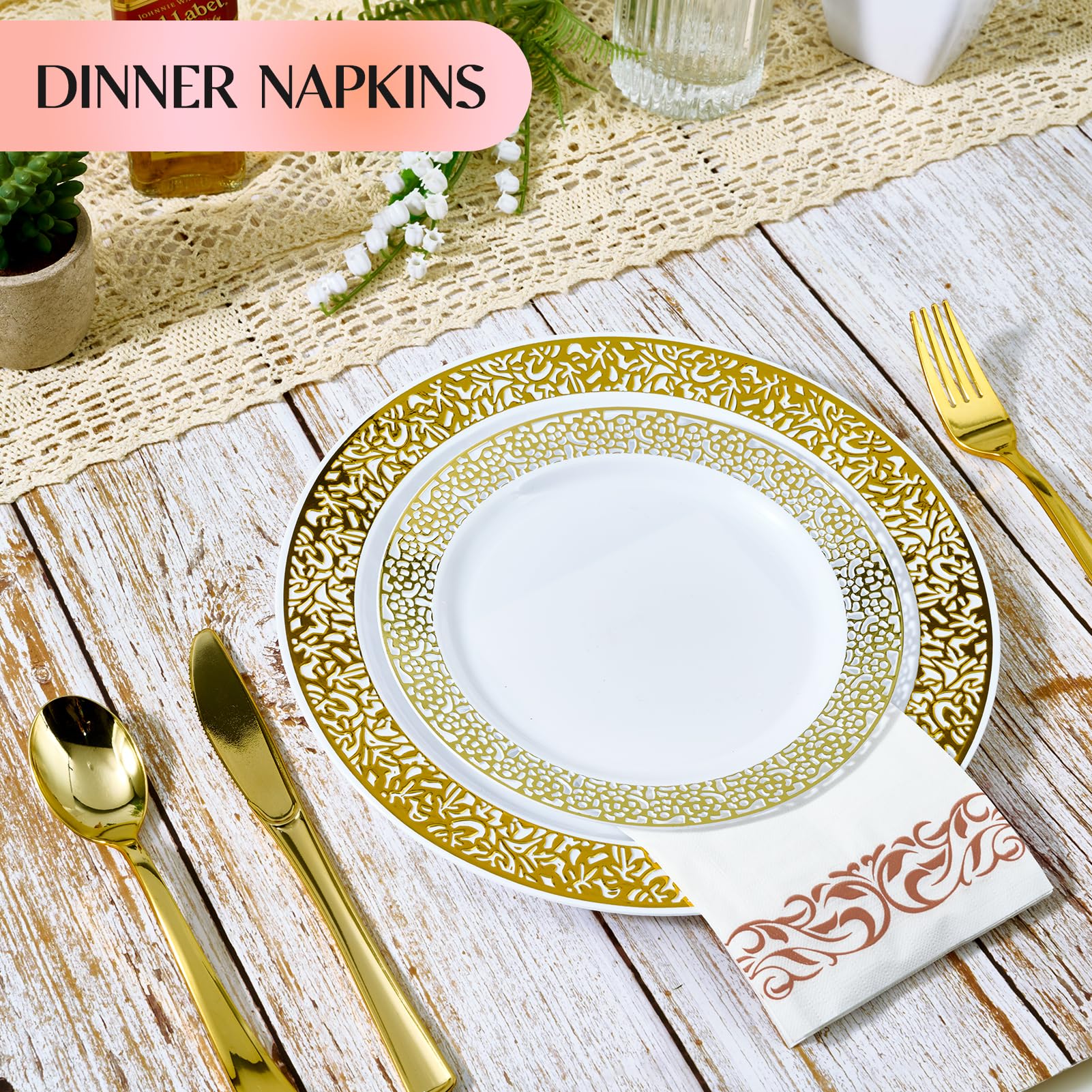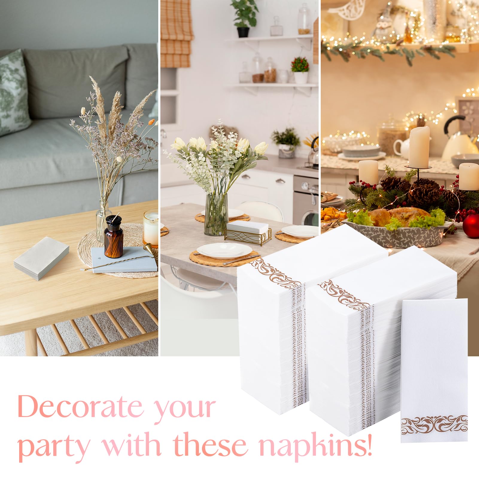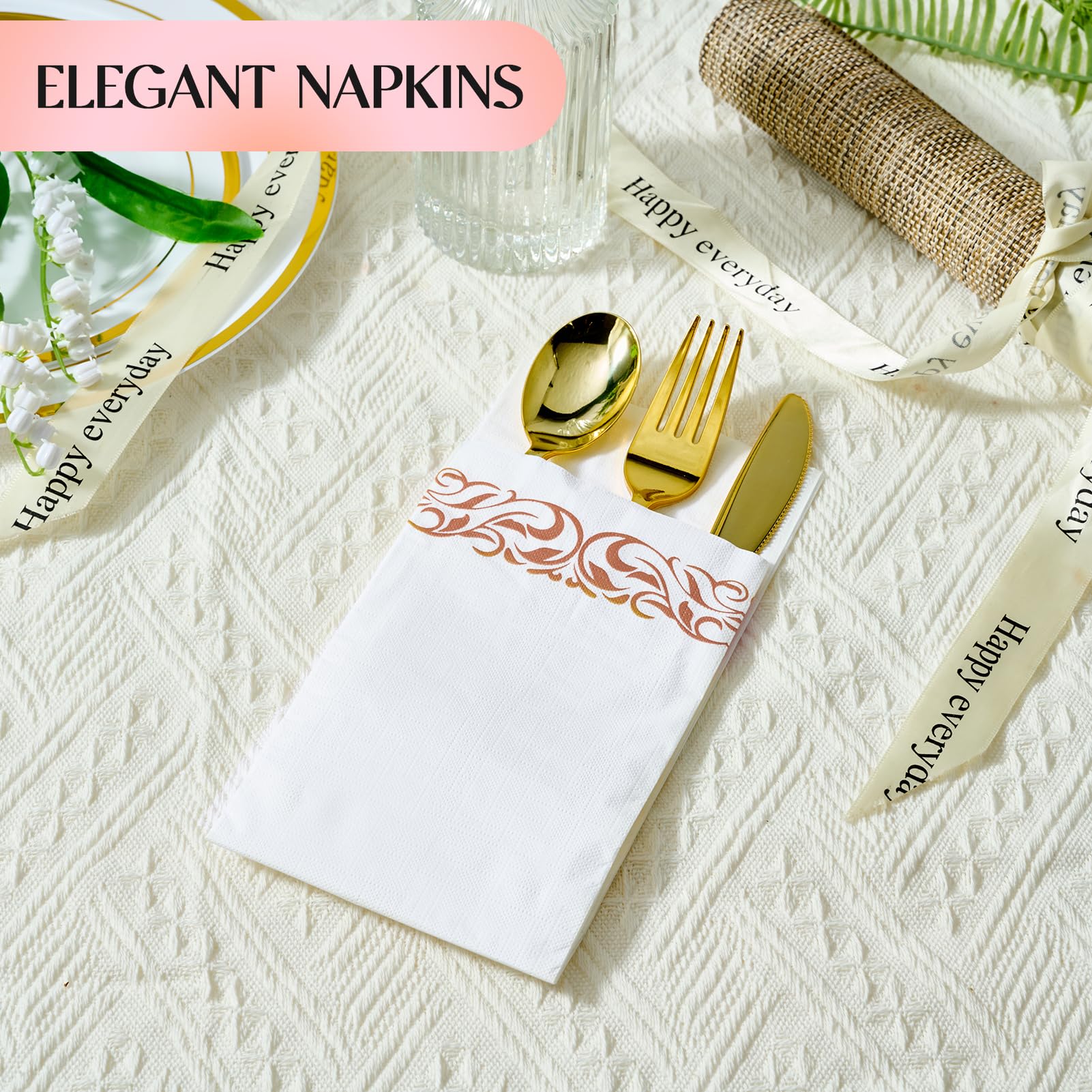 Elegant Design: The white dinner napkins are printed with a delicate rose gold trim decorative design, which shows your fashion sense, Adding charm and elegance to your dining table, bedroom. providing guests premium comfort and luxury
