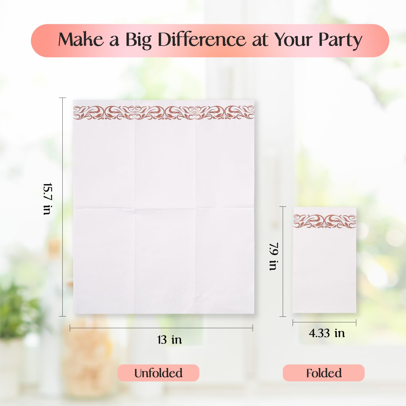 Measurement: These 3-ply luncheon/dinner napkins are impressively sized. Folded, they measure roughly 4.33 x 7.9 inches. Unfolded, it stretches out to an incredible 15.7 x 13 inches