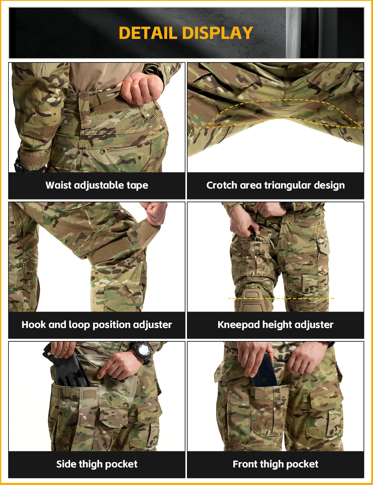 A PROFESSIONAL ARMY COMBAT PANTS: a) Come with a set of removable combat knee pads, when not using knee pads, just install the Built-in flap covers kneecap. b) Unique low-profile waist adjust system and knee pad height adjust system makes it very functional. And also with size adjustment at the back of waist, knee and ankle position.