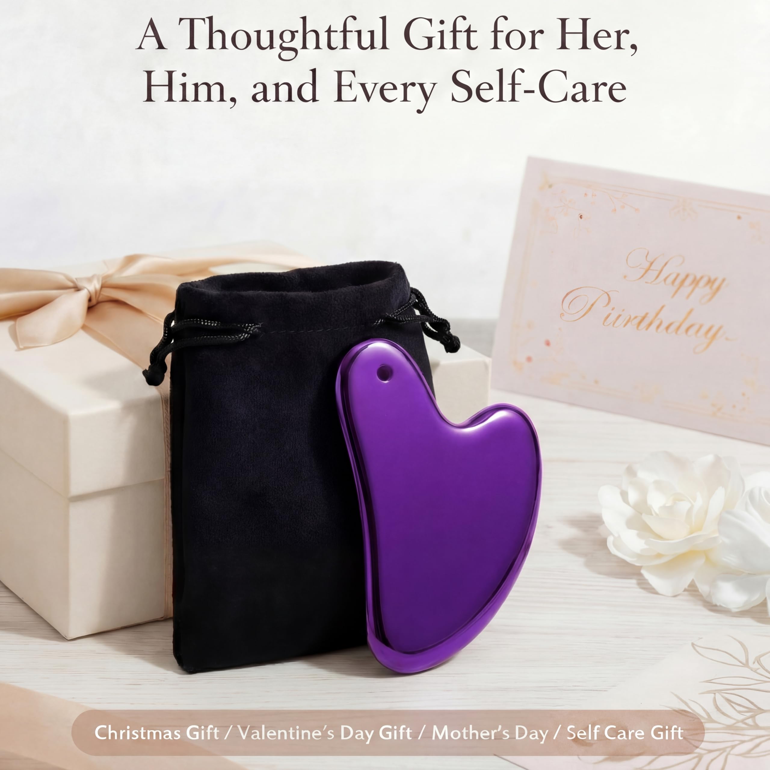 Practical Gift Set:our stainless steel gua sha tool (3.5x2.2x0.14 in, 85-90g) is polished to a mirror-like finish, compact yet sturdy, and comes with a travel pouch; Nice self-care gift for busy individuals, therapists, coaches, or loved ones on Christmas, Mother's Day, or Valentine's Day