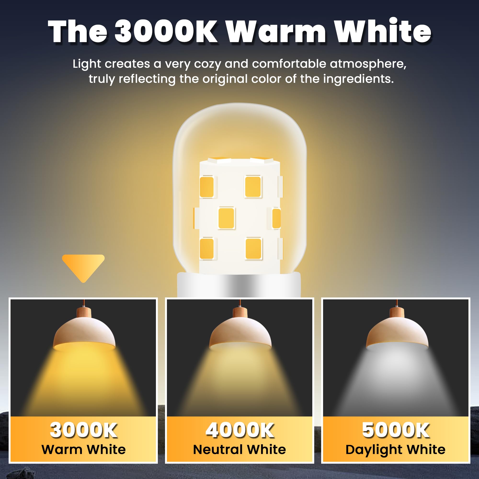 Energy-Saving Brilliance Say goodbye to high electricity bills! Our 3W LED bulb produces a bright 380 lumens of warm white 3000K light, equivalent to a traditional 40W incandescent bulb. It saves up to 90% on energy consumption, making it an eco-friendly choice for your home. Perfect for use as a microwave light or kitchen hood light bulb, it reduces your carbon footprint without sacrificing brightness