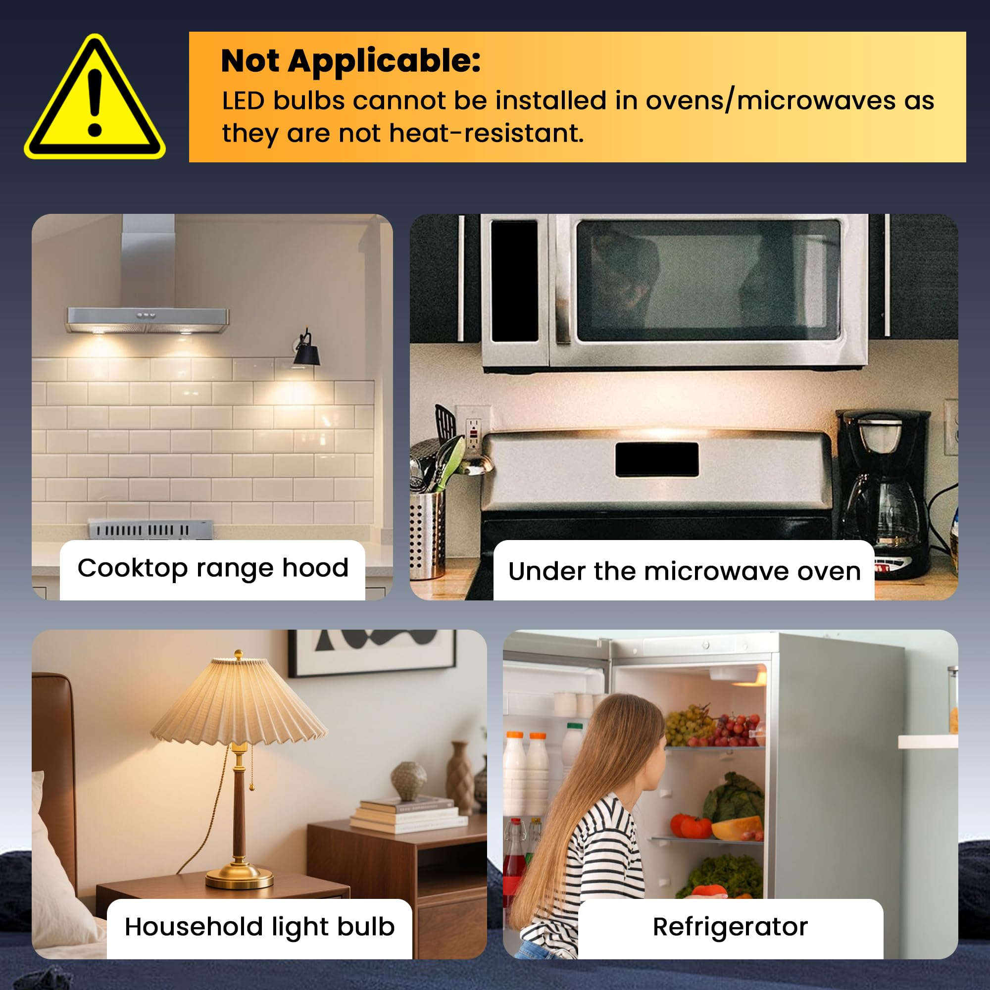 Instant & Flicker-Free Lighting Tired of waiting for lights to warm up? This LED bulb provides instant full brightness the moment you turn it onβno delays, no flickering, and no annoying buzzing sounds. With a high CRI 85, it renders colors vividly and accurately, making your food look more appetizing under the microwave light bulbs under hood. Enjoy a comfortable, well-lit cooking experience every time