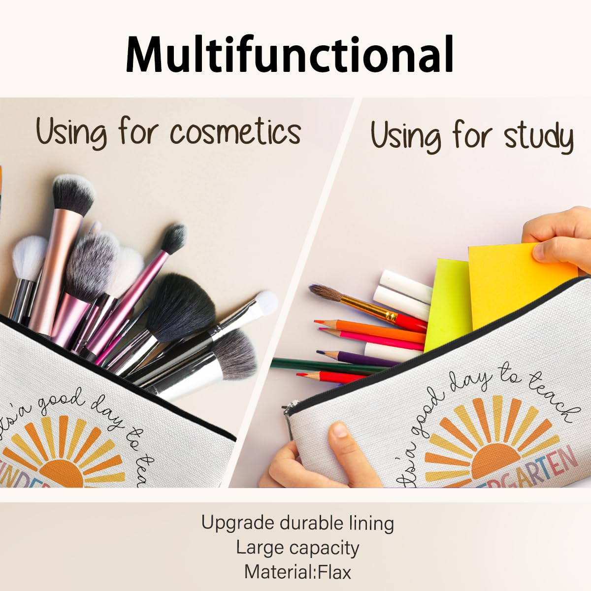 Material: The cosmetic bag is made of premium linen fabric, which is soft to touch, light weight and durable. It's easy for you to wash and carry.