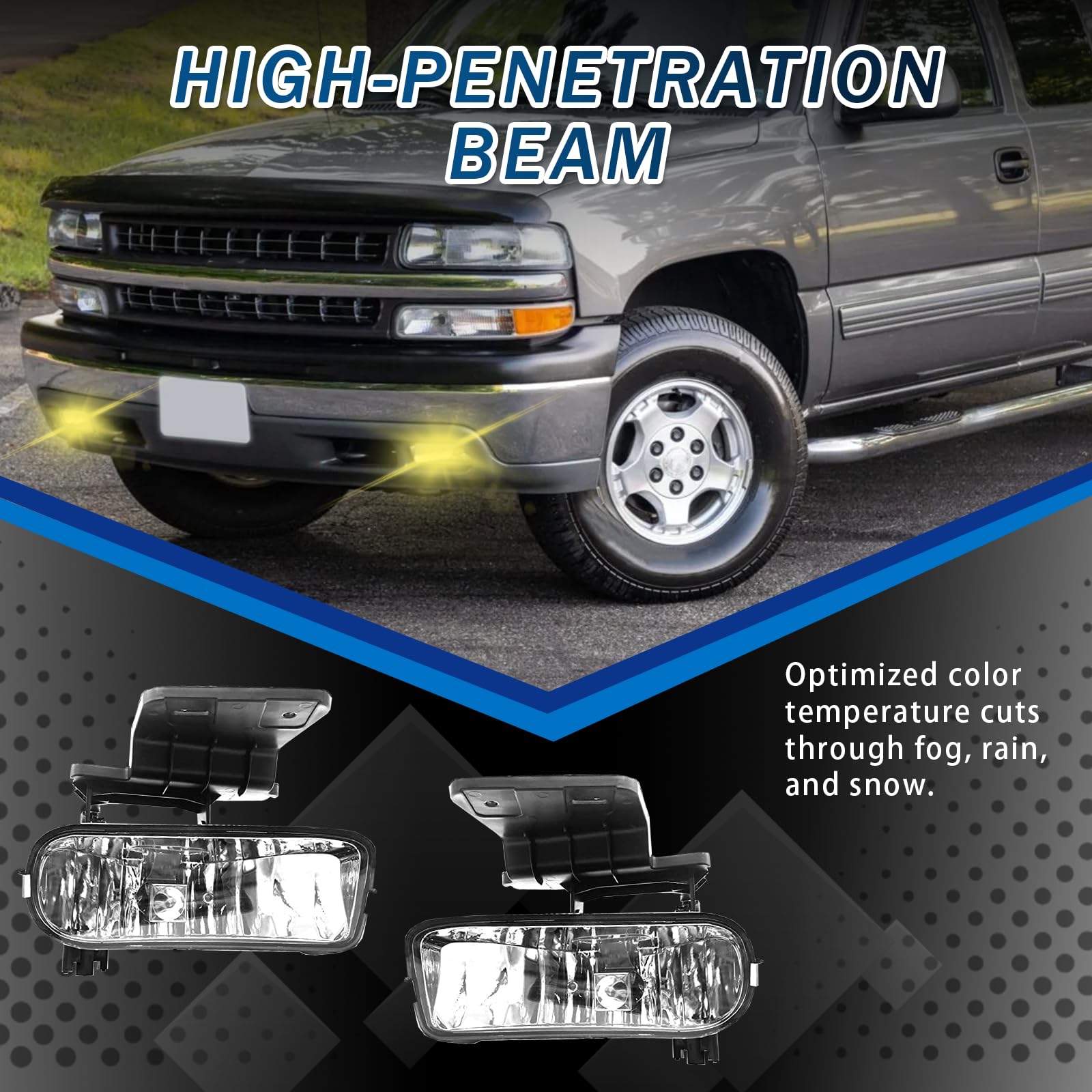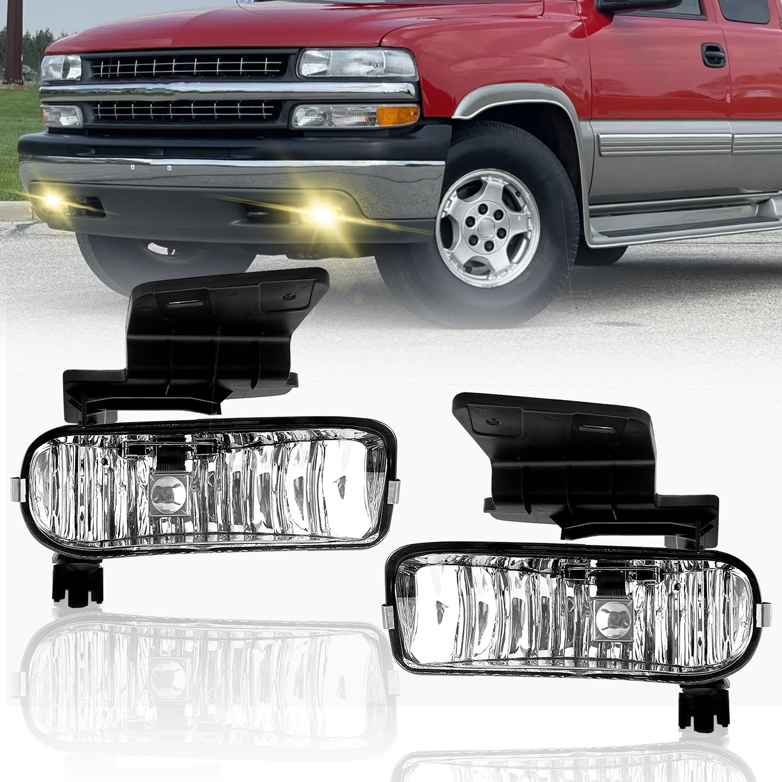 【Fitment】These fog lights are compatible with 1999 2000 2001 2002 Chevy Silverado 1500 2500/ 2001 2002 Silverado 1500HD 2500HD 3500/ 2000 2001 2002 2003 2004 2005 2006 Tahoe Suburban 1500 2500. Please double check the fitment before your purchase to make sure you get the correct part.