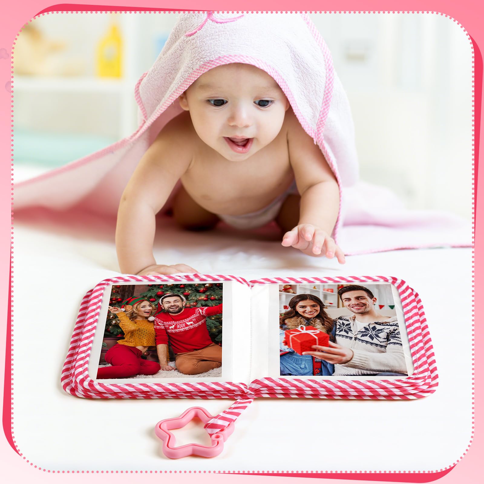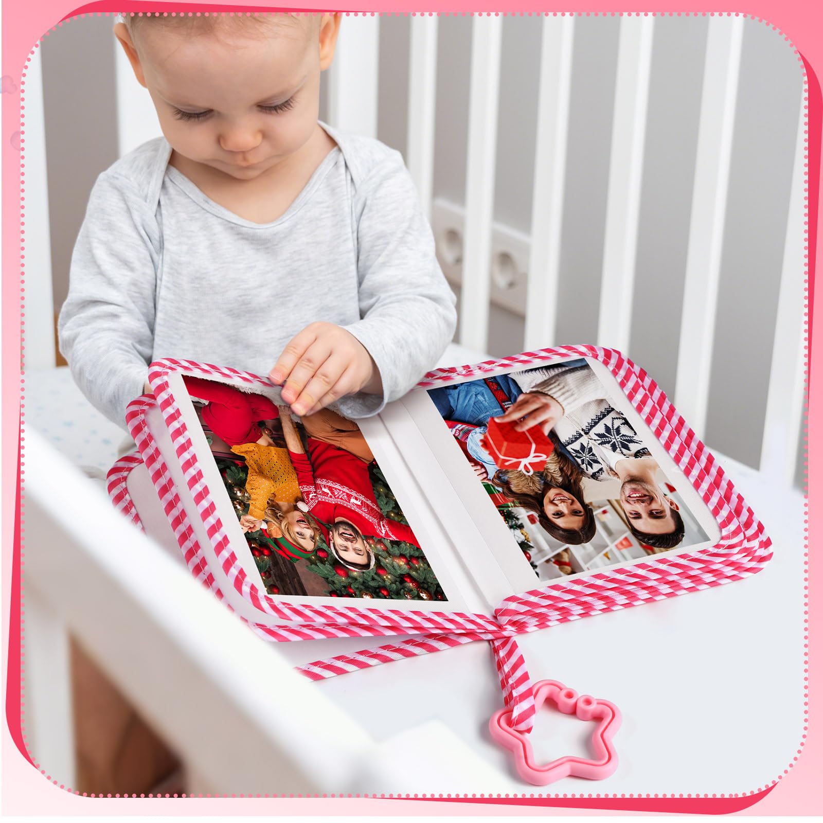 Size: with dimensions of 5.5 x 7 in, our family photo album can comfortably hold up to 4" x 6" photos; Plus, it comes with a handy teether ring that lets you attach it to any crib, stroller, or activity gym; You can even use it as a storybook for easy reading
