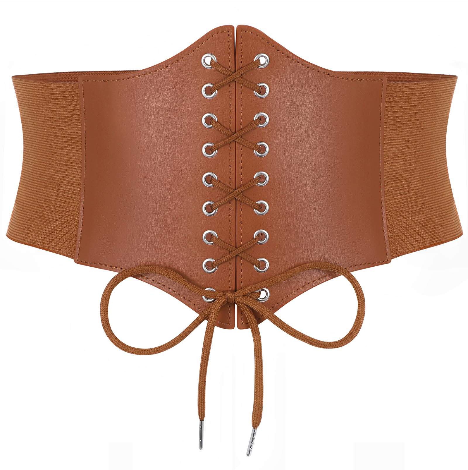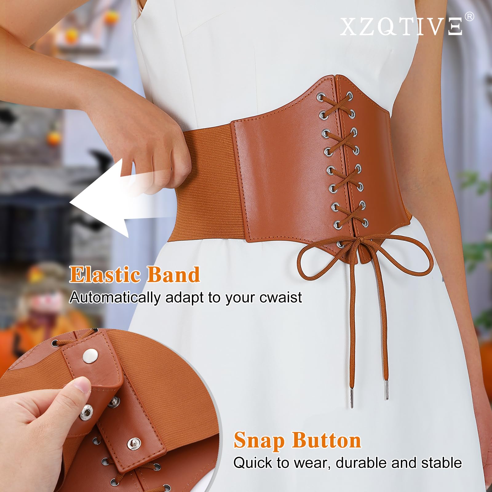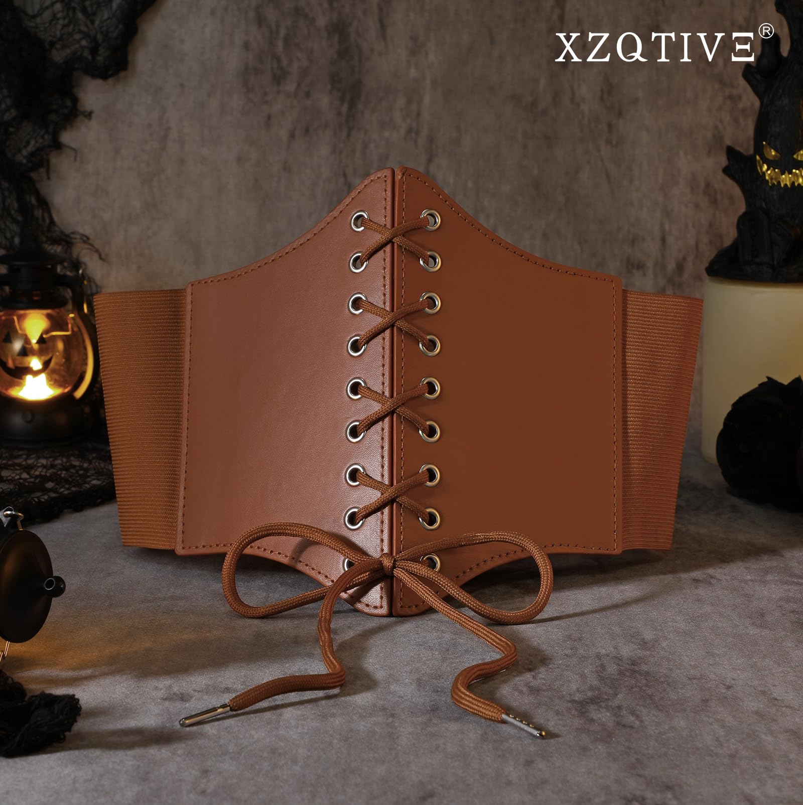 ➜ Black Corset Belt for Waist - Wide Costume cinching belt with tied corset leather on the front, elastic webbing band on the back, snap button closure to lock the belt,