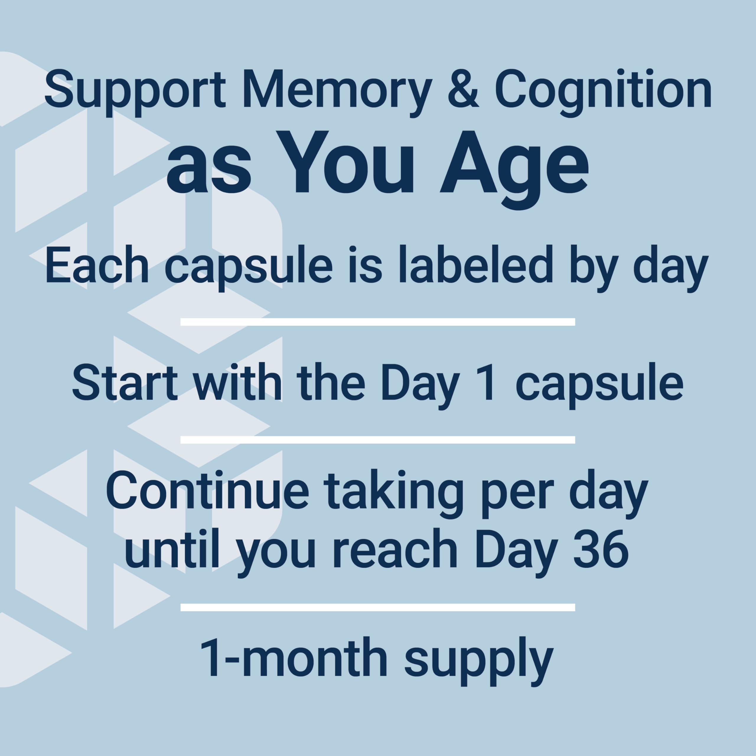 Memory Protect is a novel formulation for memory health and cognitive health support. It comes in blister packaging to stagger the doses of each nutrient: each capsule is labeled by day. To take Memory Protect, start the first day by taking the capsule labeled Day 1. Continue taking one capsule per day in consecutive order until you reach Day 36. Gluten-free, non-GMO, and manufactured in the United States.
