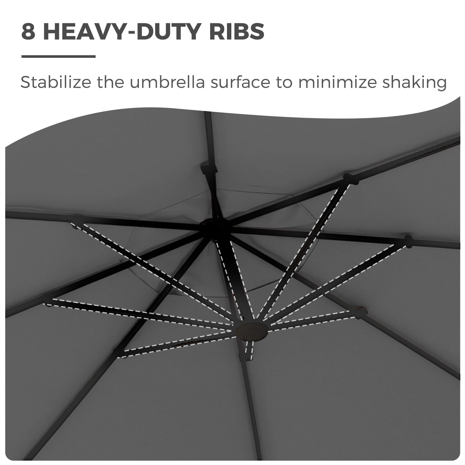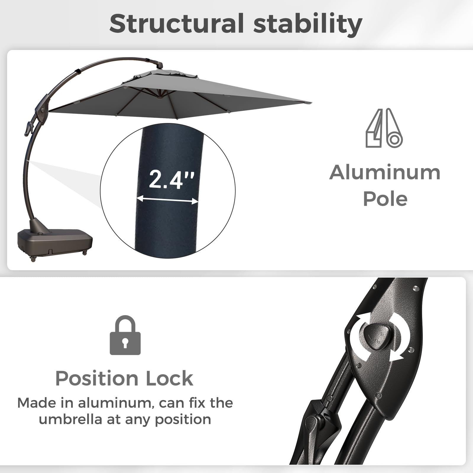 UNCOMPROMISING DURABILITY: This large offset umbrella features a heavy-duty curved aluminum frame with a powder-coated finish for elegance and corrosion resistance. The 250G polyester canopy offers UPF50+ sun protection and water resistance
