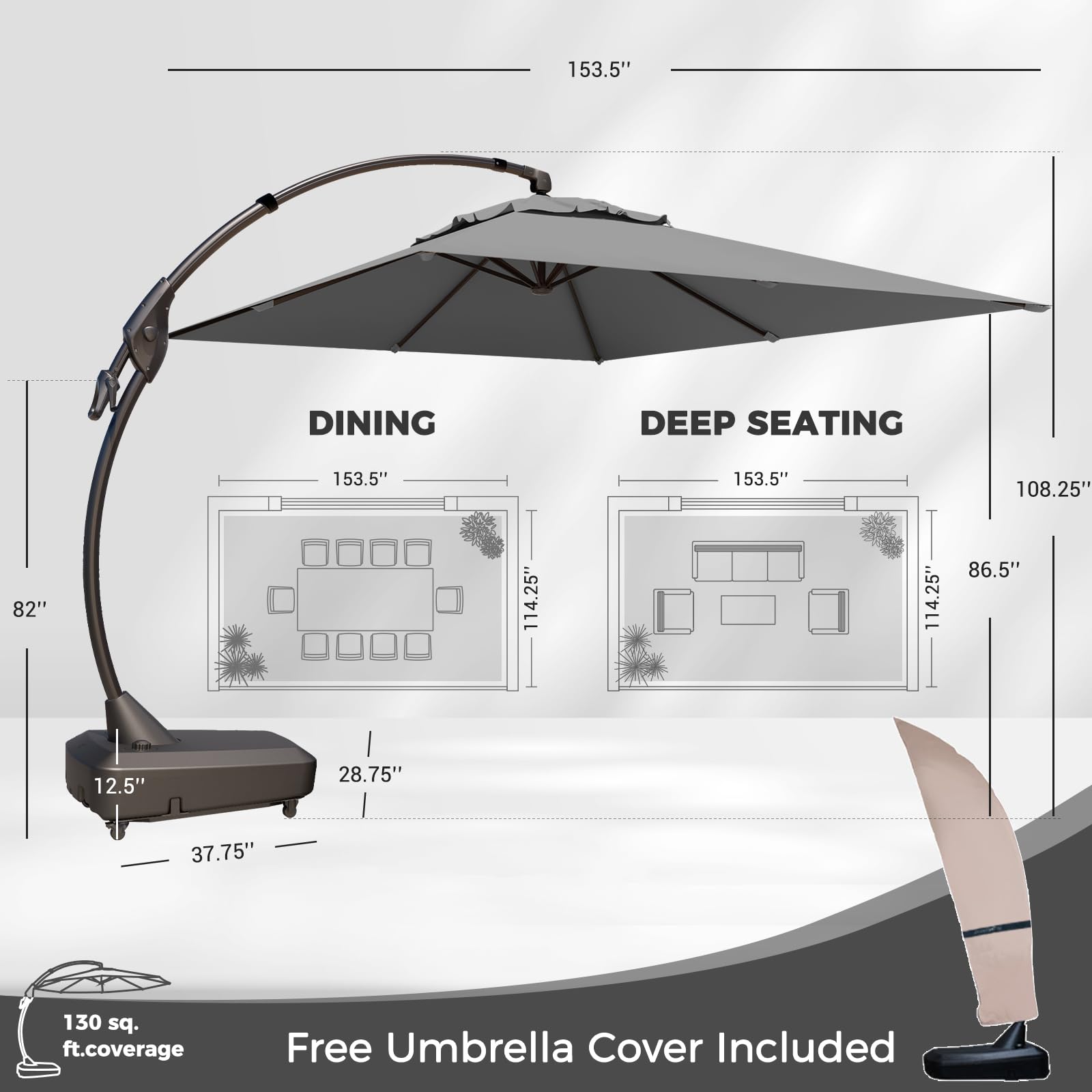 UNPARALLELED PROTECTION: Enjoy 130 square feet of expansive shade. Perfect for dining, lounging, and gatherings, this cantilever umbrella combines style and function to shield you from the sun and elevate your outdoor experience