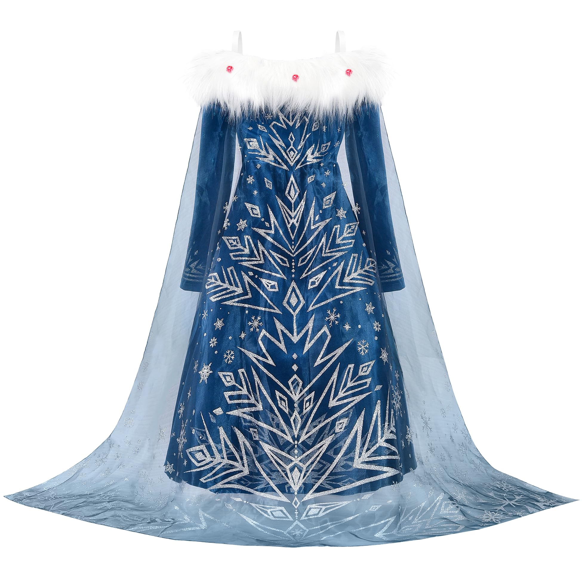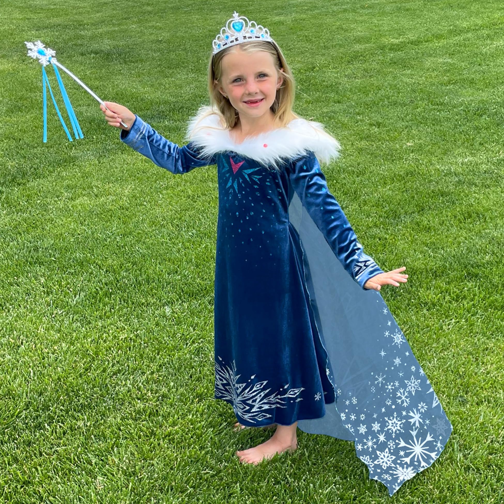 Shining Princess Costume With Long Cape: non-removable cape with shining snowflake pattern. A great ideal for your girls princess costume.